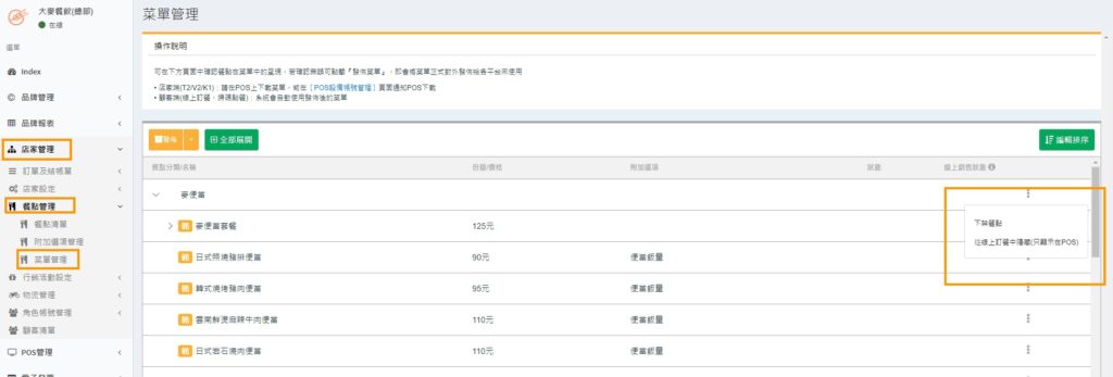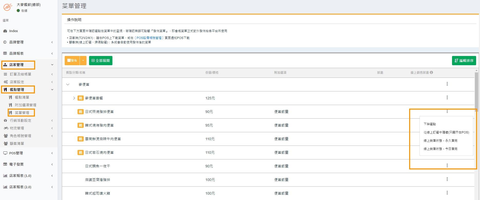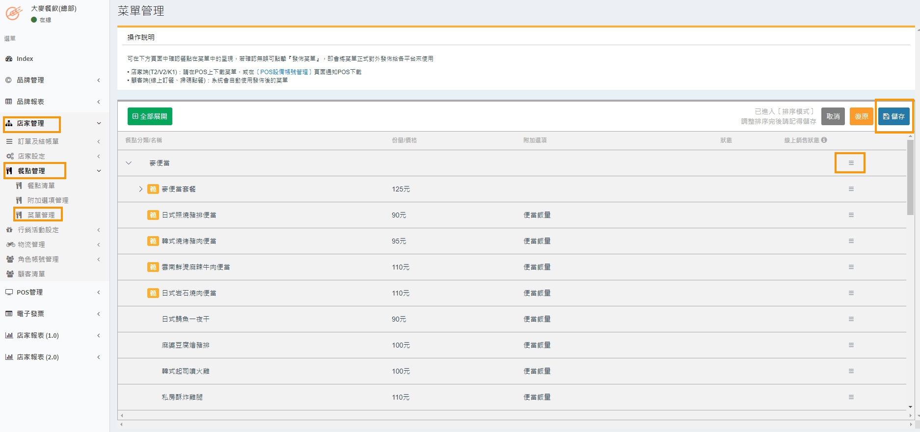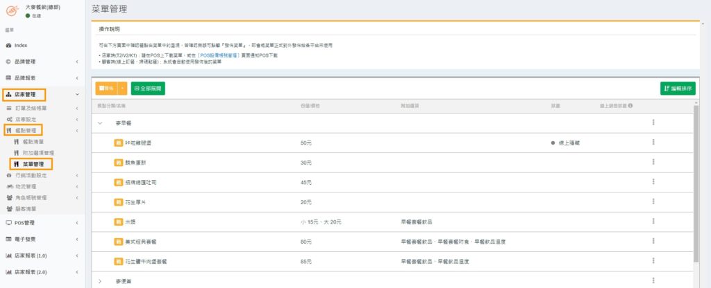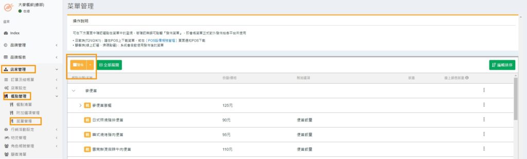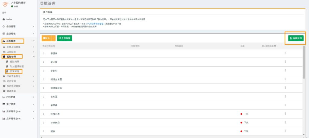 若需調整菜單的順序或餐點的線上銷售狀態,如:今日售完、永久售完、下架餐點(客人端及機器中皆看不到該品項)等,您可以在此頁面操作調整
