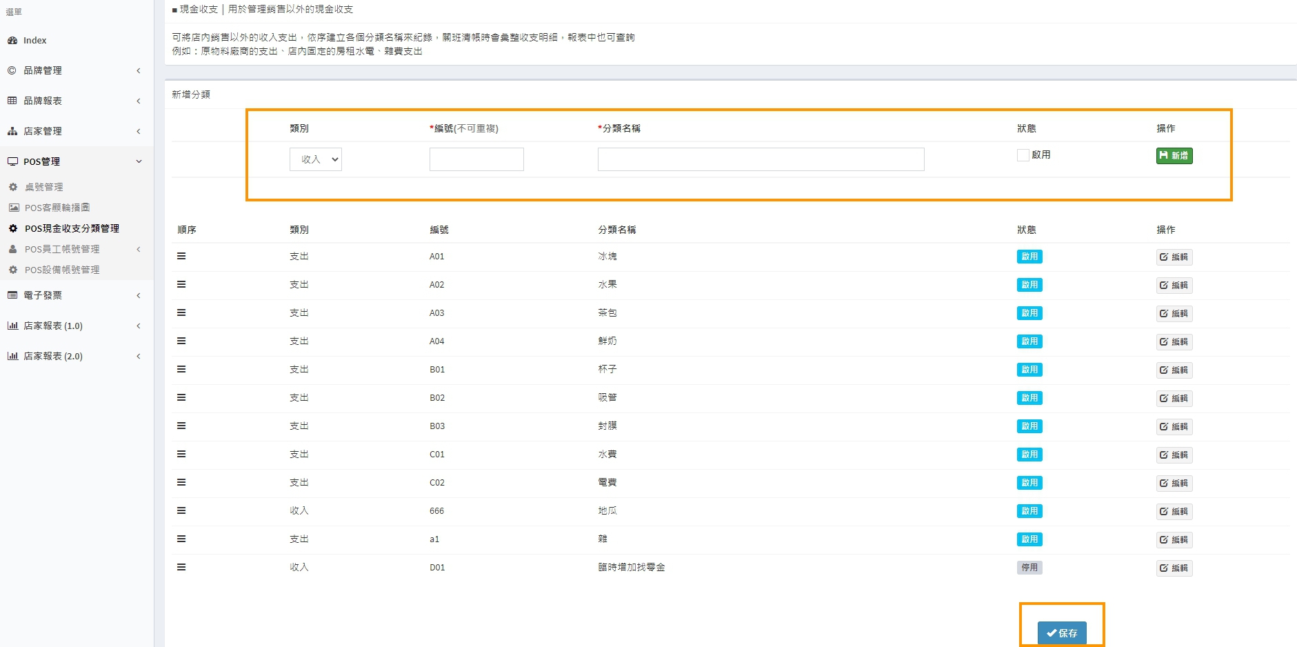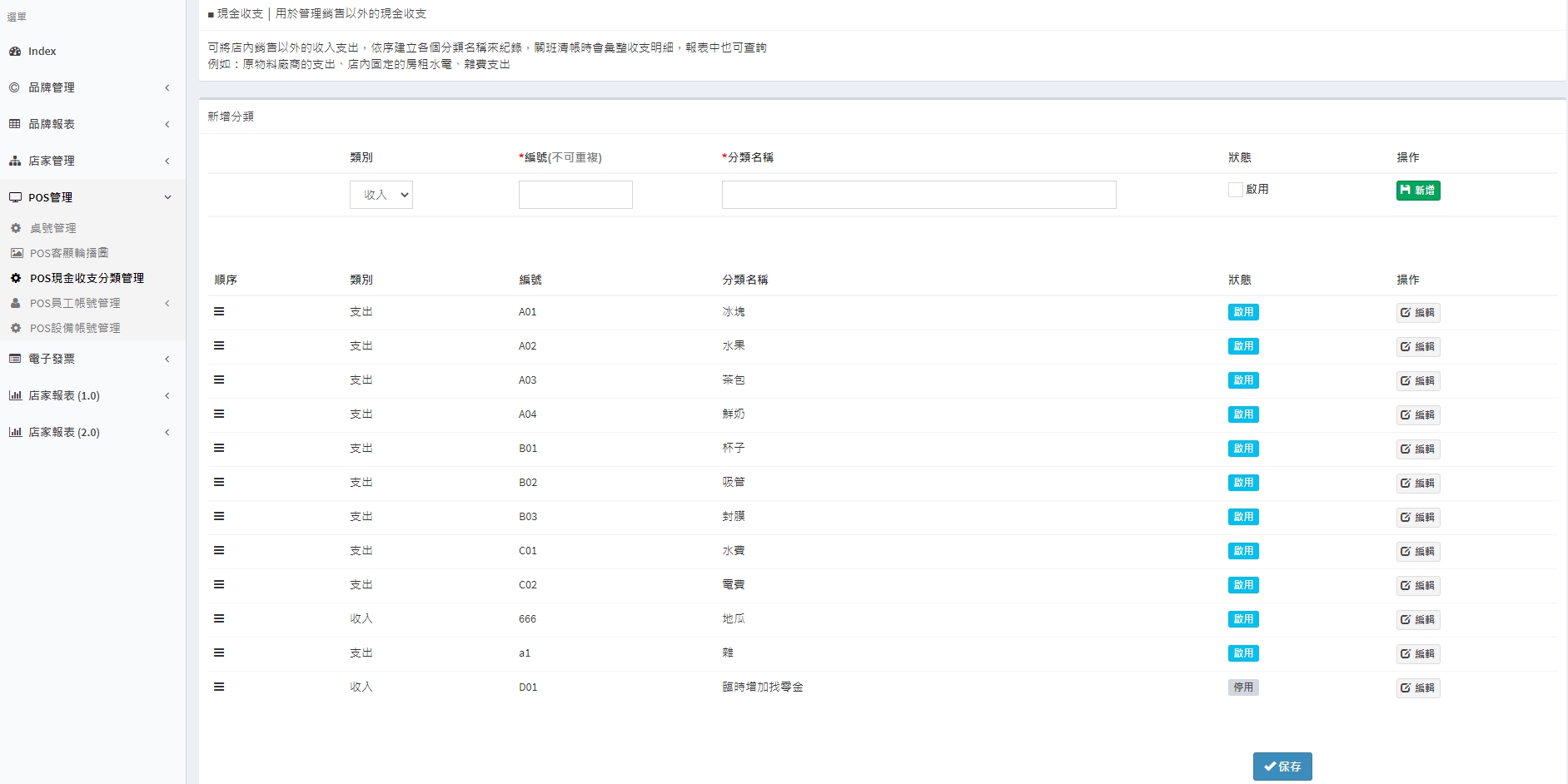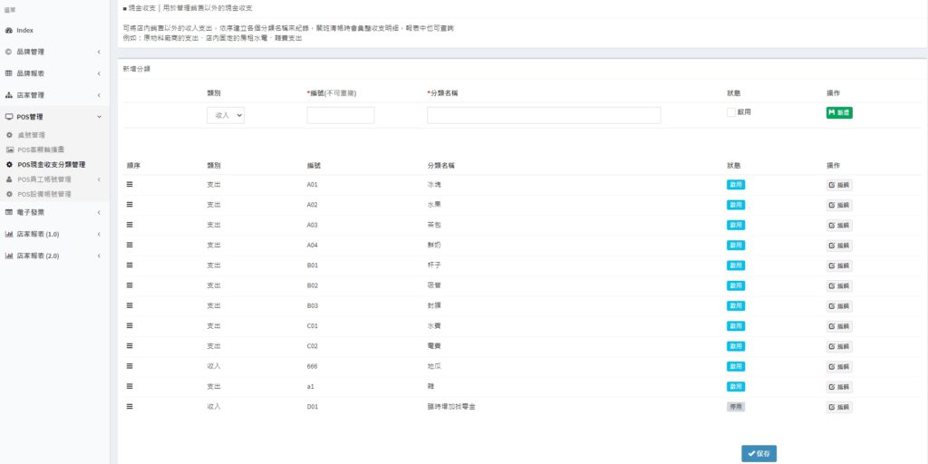於上方新增欄位輸入類別、編號及分類名稱,並將狀態更改為啟用,先點選右側綠色【 新增 鈕,再點選下方藍色【 保存 鈕,您就可以在POS機上看到新增的分類囉!
