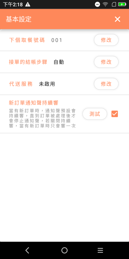 搜尋 搜尋 首頁 » MoneyPOS操作 » 工具箱 » 其他 » V2接單機 工具箱介紹/基本設定 取餐號設定 若您按下結算後,取餐號碼自動調整從1開始。 代送服務設定 代送物流業者需提前一小時呼叫,建議您可選擇【結帳後自動執行】。 新訂單通知聲持續響 預設為持續響至您按下接單鍵為止,若您只需響一次,請您取消勾選。 ✍🏻找到答案了嗎? Let us know if you liked the post. That’s the only way we can improve. 🙂 🙁 Categories: MoneyPOS操作其他工具箱