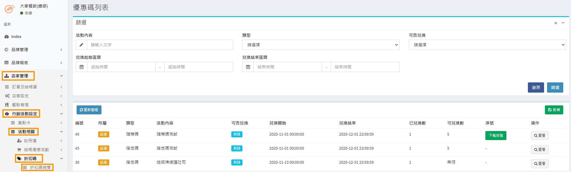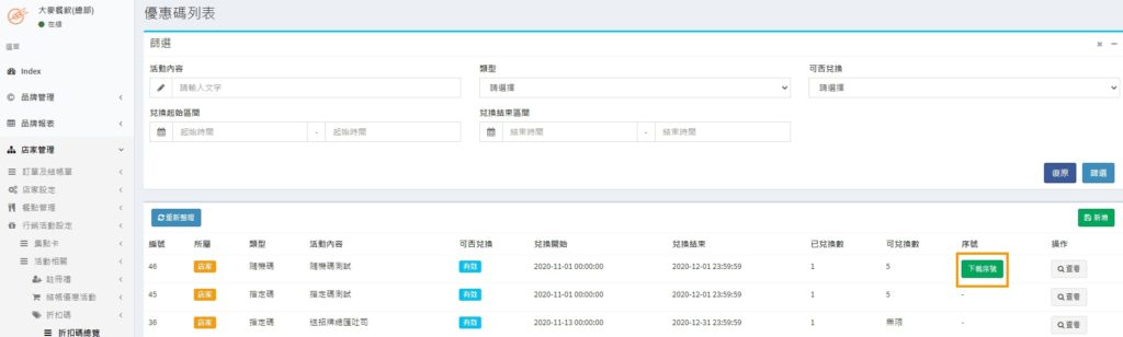 您可於折扣碼總覽查詢及新增,提醒您須先建立一張優惠券(可參考教學設定),新增時才能選取到該優惠券喔!