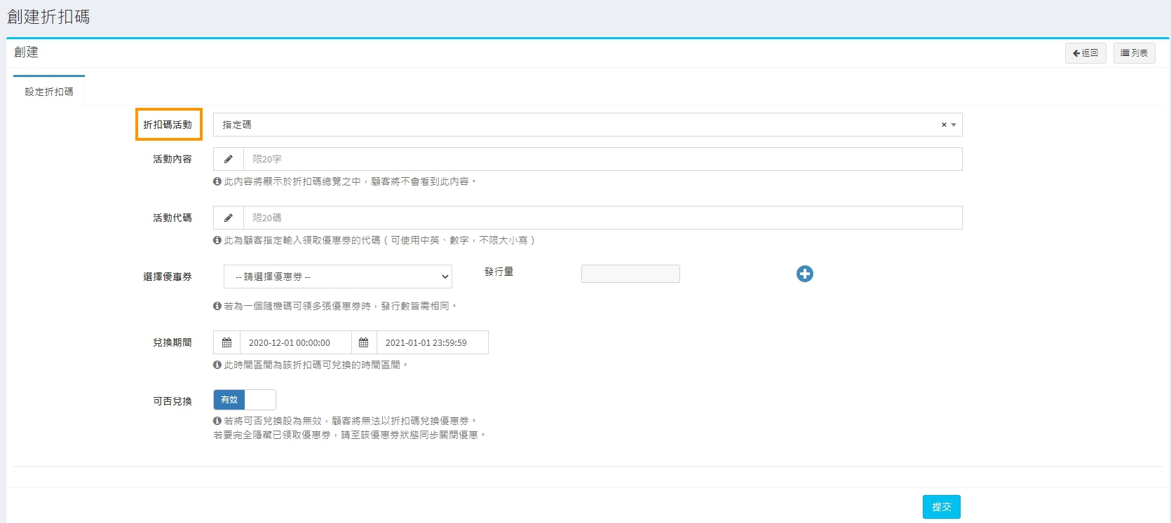 #指定碼:專屬活動代碼,可限定指定顧客使用優惠