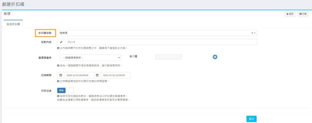 - 可否兌換記得切換為『有效』,若將可否兌換設為無效,顧客將無法以折扣碼兌換優惠券。若要完全隱藏已領取優惠券,請至該優惠券狀態同步關閉優惠喔!