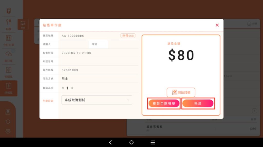 若需要重開,可點擊【 複製至點餐單 】將原有餐點複製過去後,可調整發票類別並重新結帳