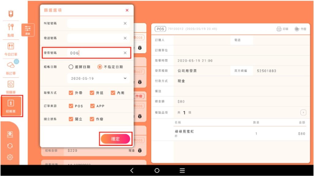2. 進入【結帳單列表】點擊【 搜尋 】小圖示,搜尋這筆發票號碼