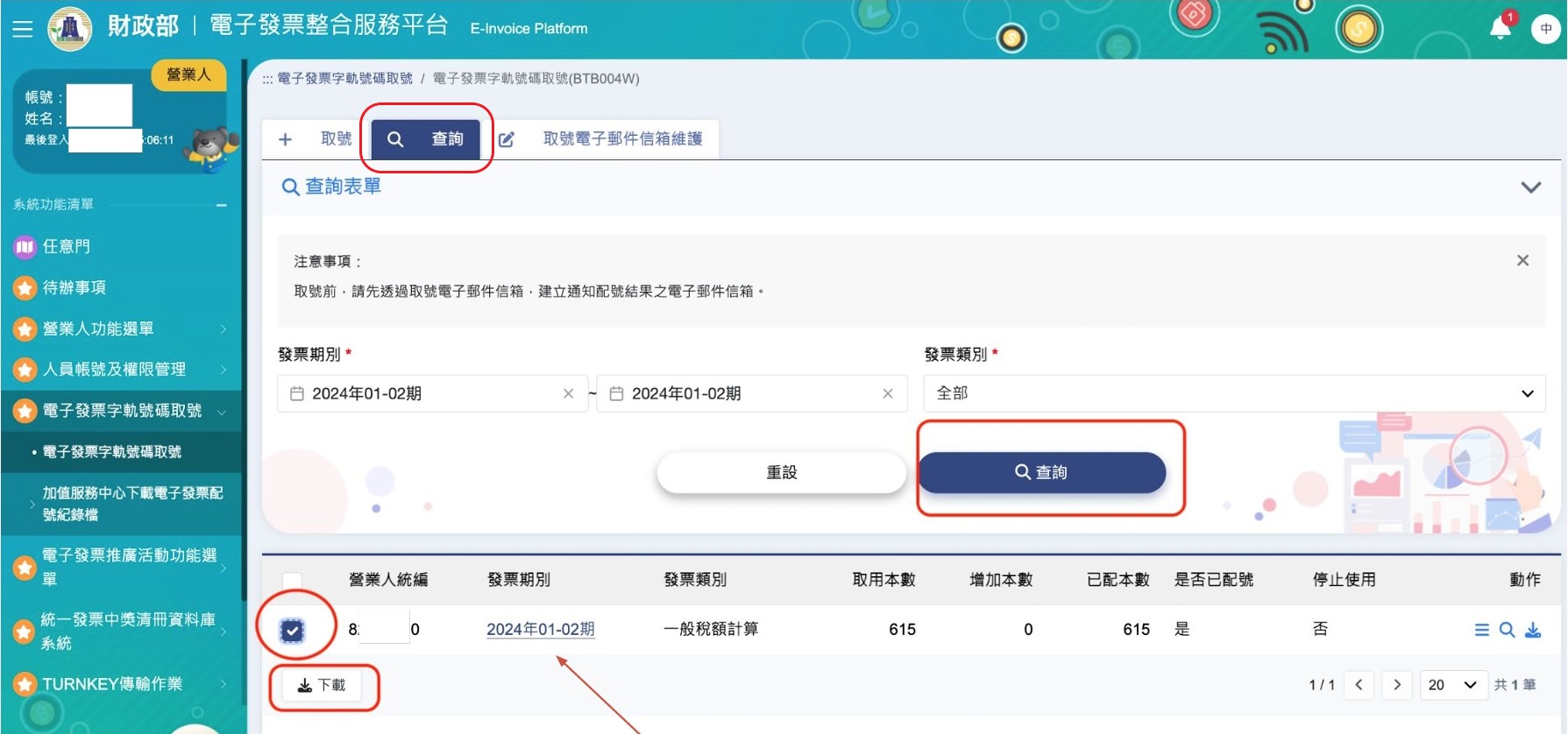進入取號頁面,選取指定發票期別後,點擊【 查詢 】,並下載字軌檔案