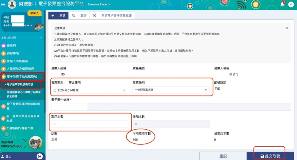 3. 進入取號頁面,選擇發票期別及類型 (通常是一般稅額)