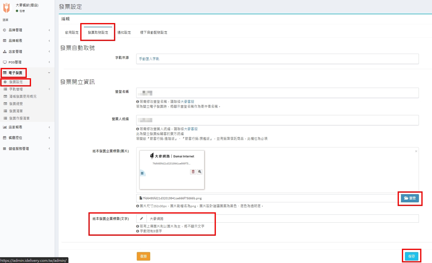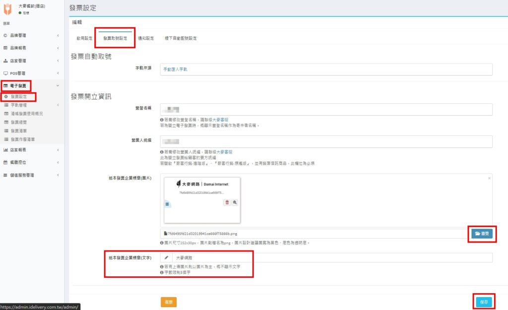 確認營業人統編是否正確,並設定發票上方顯示的圖片或文字擇一。
