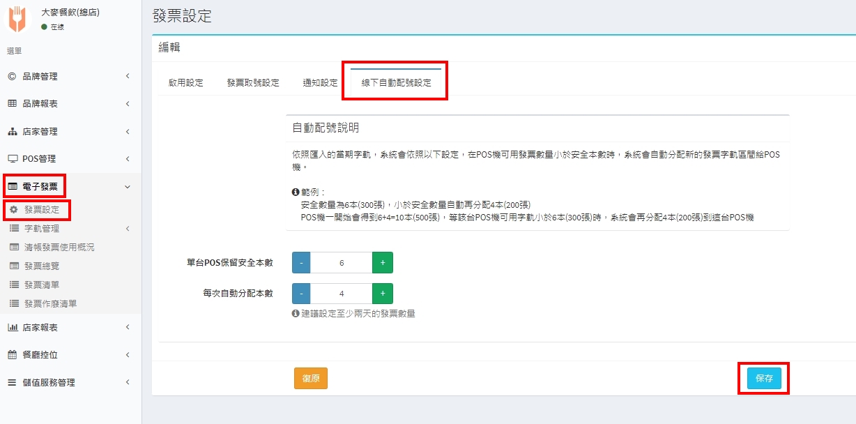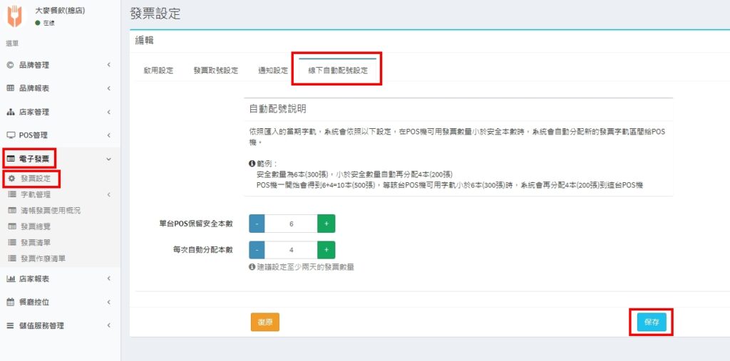 設定POS每次預先下載的發票字軌本數,可依門市發票使用速度來作調整。