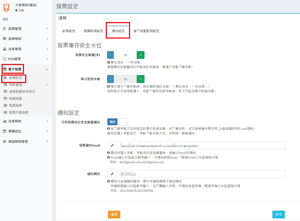 設定當可用發票字軌數量低於安全數量的通知,