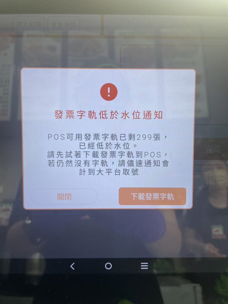 POS機一開始會得到6+4=10本(500張),等該台POS機可用字軌小於6本(300張)時,系統會在結帳時跳出【發票字軌低於水位通知】的通知,屆時再點擊【下載發票字軌】,就會再自動分配4本(200張)到這台POS機。
