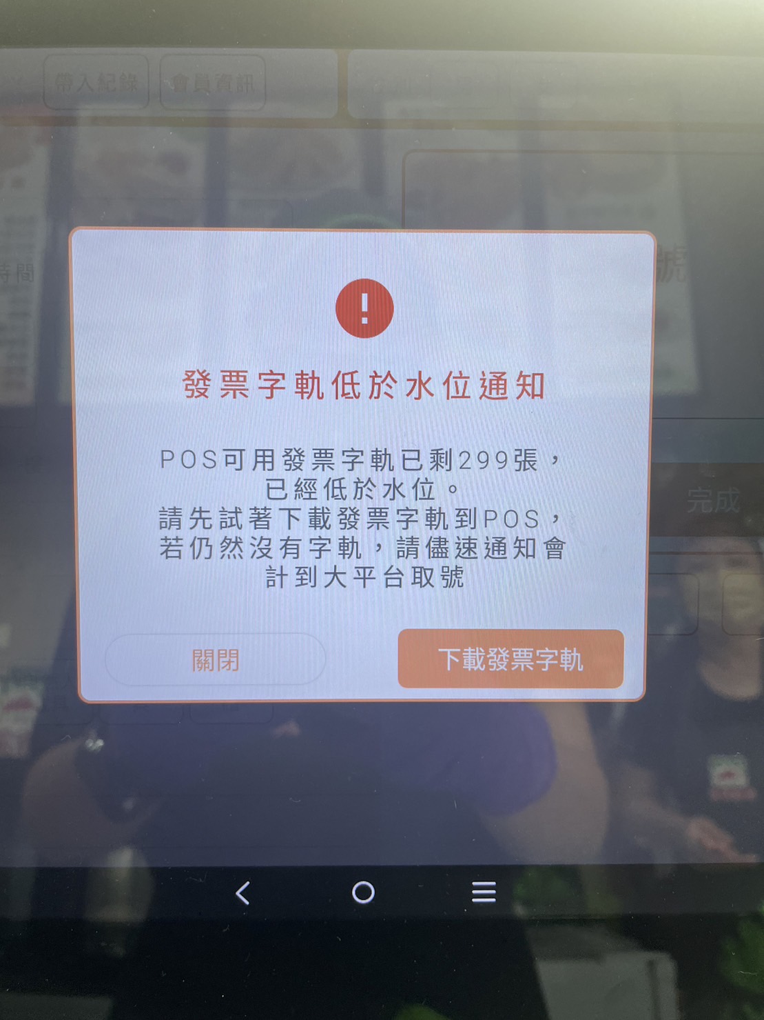 POS結帳時,顯示【發票字軌低於水位通知】示意圖: