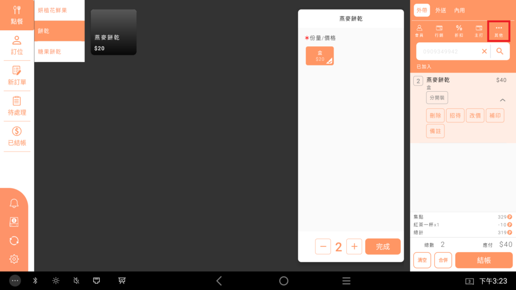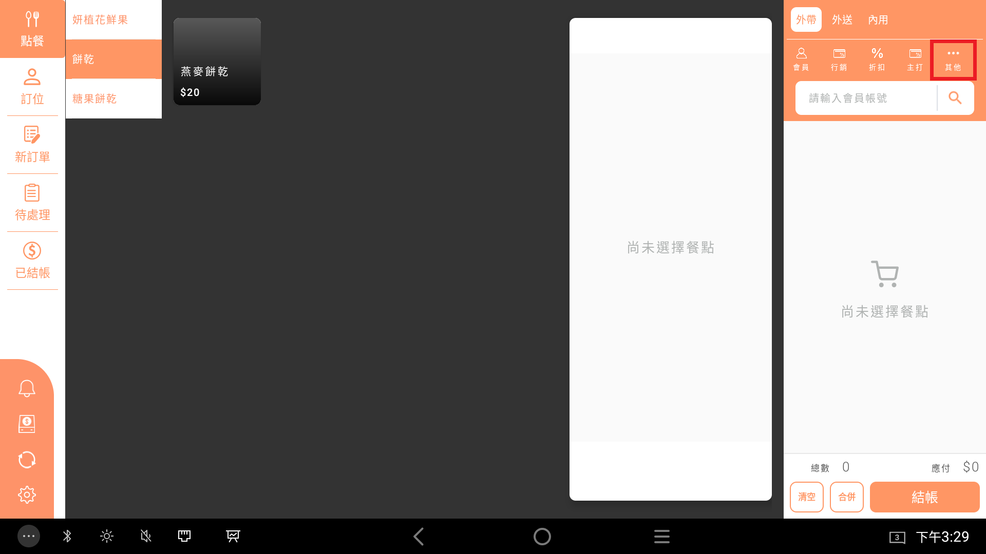 當顧客臨時離開櫃台但所點的餐點還需要時,可點選【其他】,再點擊【暫存】,即可將此訂單暫時保存在暫存清單中。