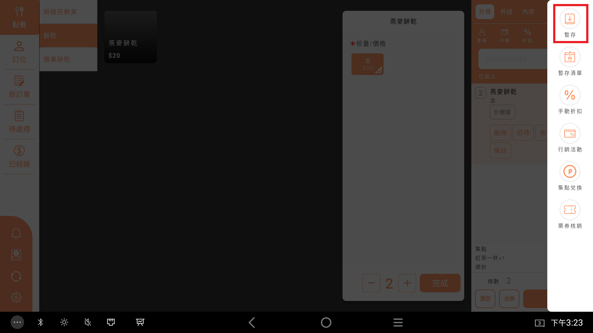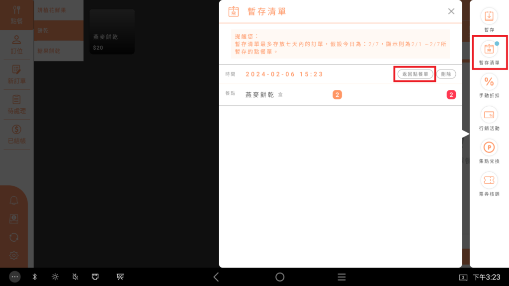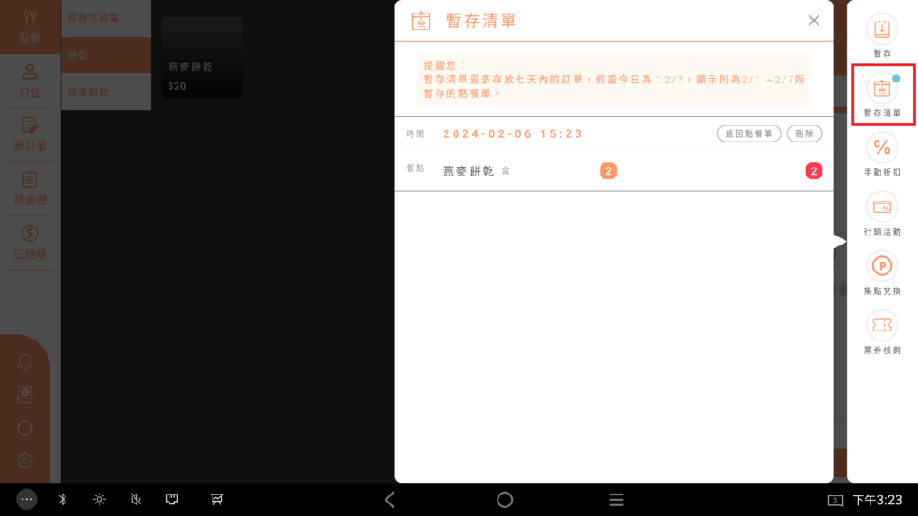 • 訂單保存在暫存清單中,依舊可以進行結算、關班清帳作業。