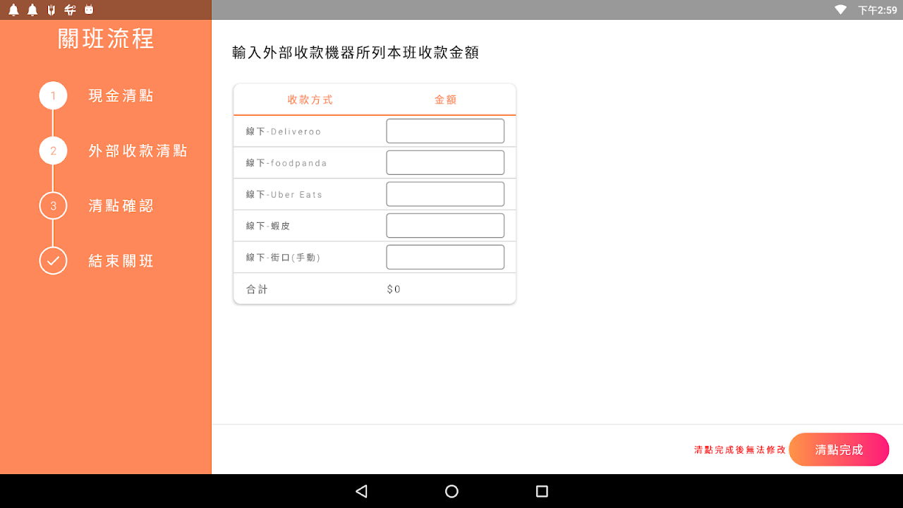 當店家有使用不同的收款別,也需填入外部收款金額,輸入完成後,點擊清點完成
