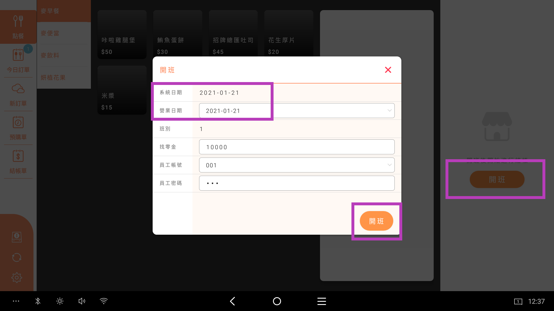 2. 輸入員工帳號以及找零金,右下開班。