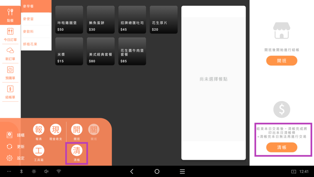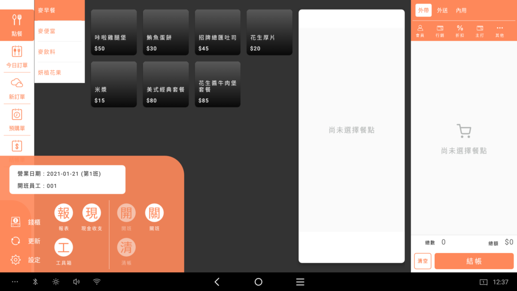 開班完成後,點餐畫面左方會出現班別及開班人員,即可開始點餐囉