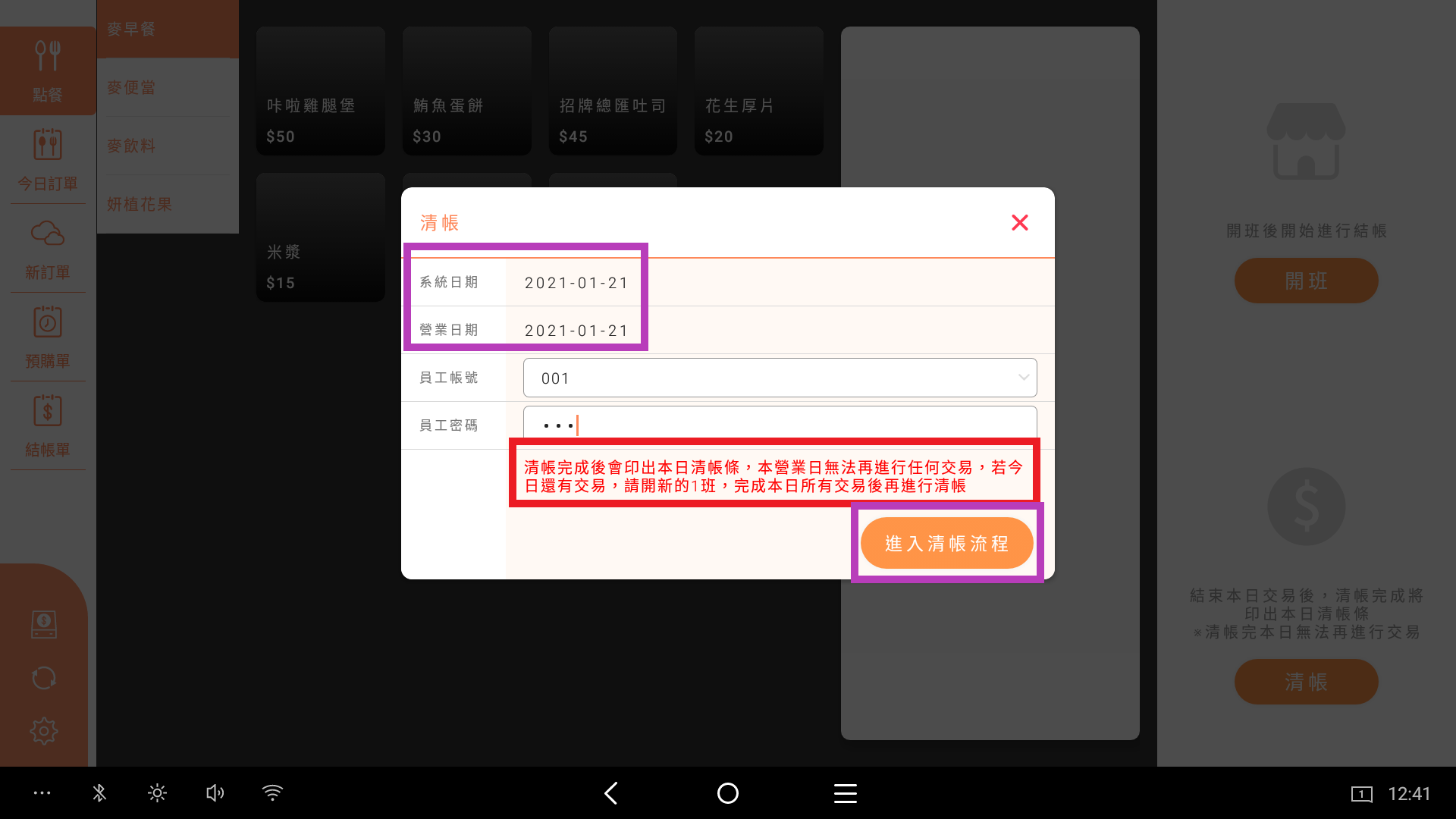 ※麥家小提醒: 關班流程無法中斷 ,請準備好清點錢櫃現金及外部收款金額,再點擊進入關班流程