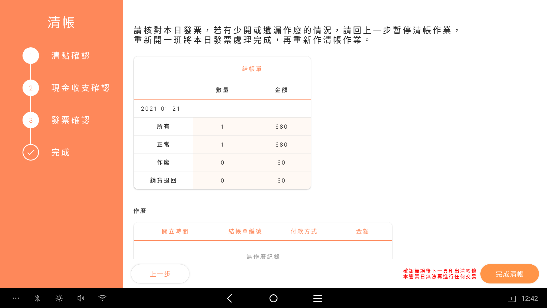 確認今日所開發票總數以及作廢發票是否已收回留存在店家。