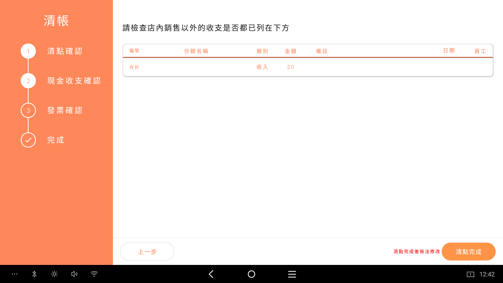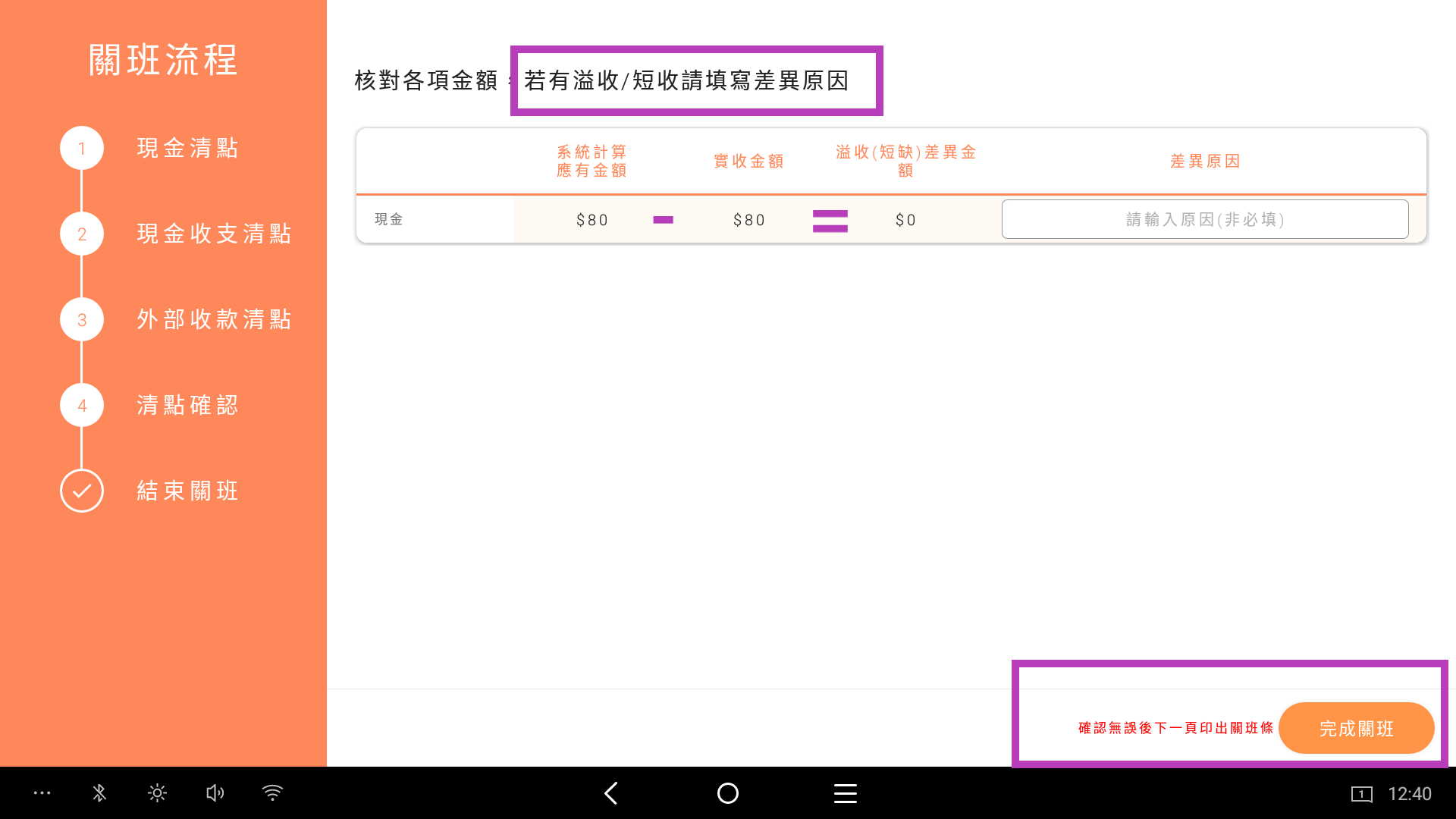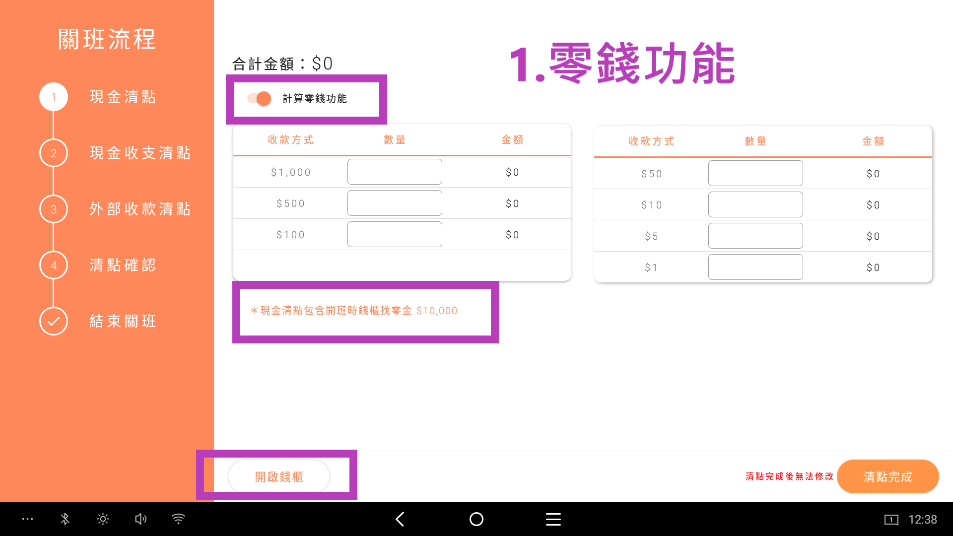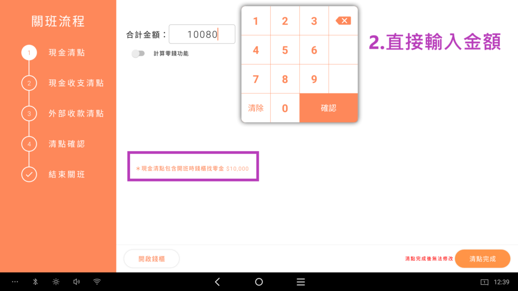 1. 使用計算零錢功能(須包含零用金)輸入完成後,點擊清點完成