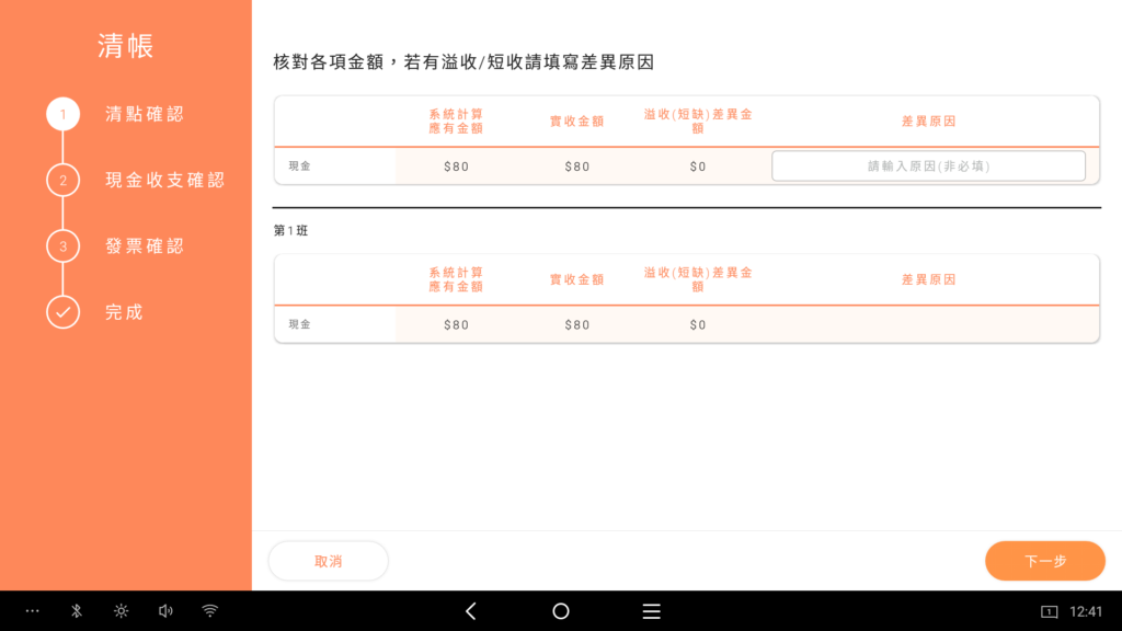 1. 核對各項金額及溢收或短缺的差異原因,下滑也可查看各班別的的金額
