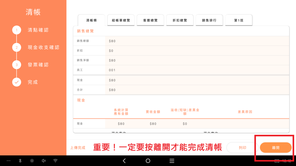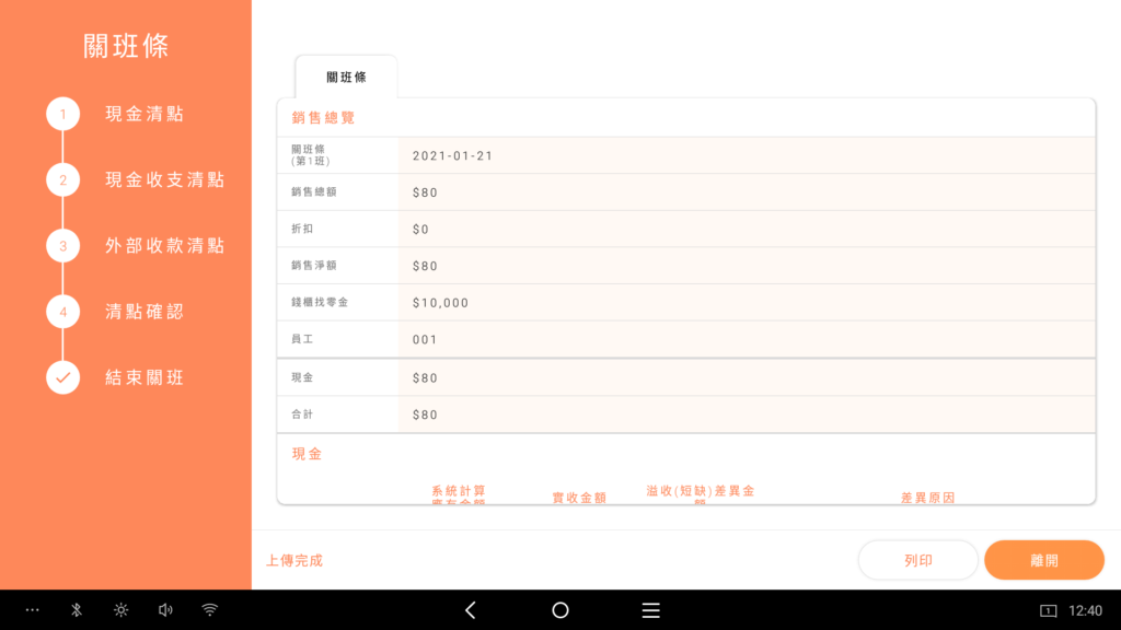 2. 確認無誤後,點擊完成關班,POS會印出關班條
