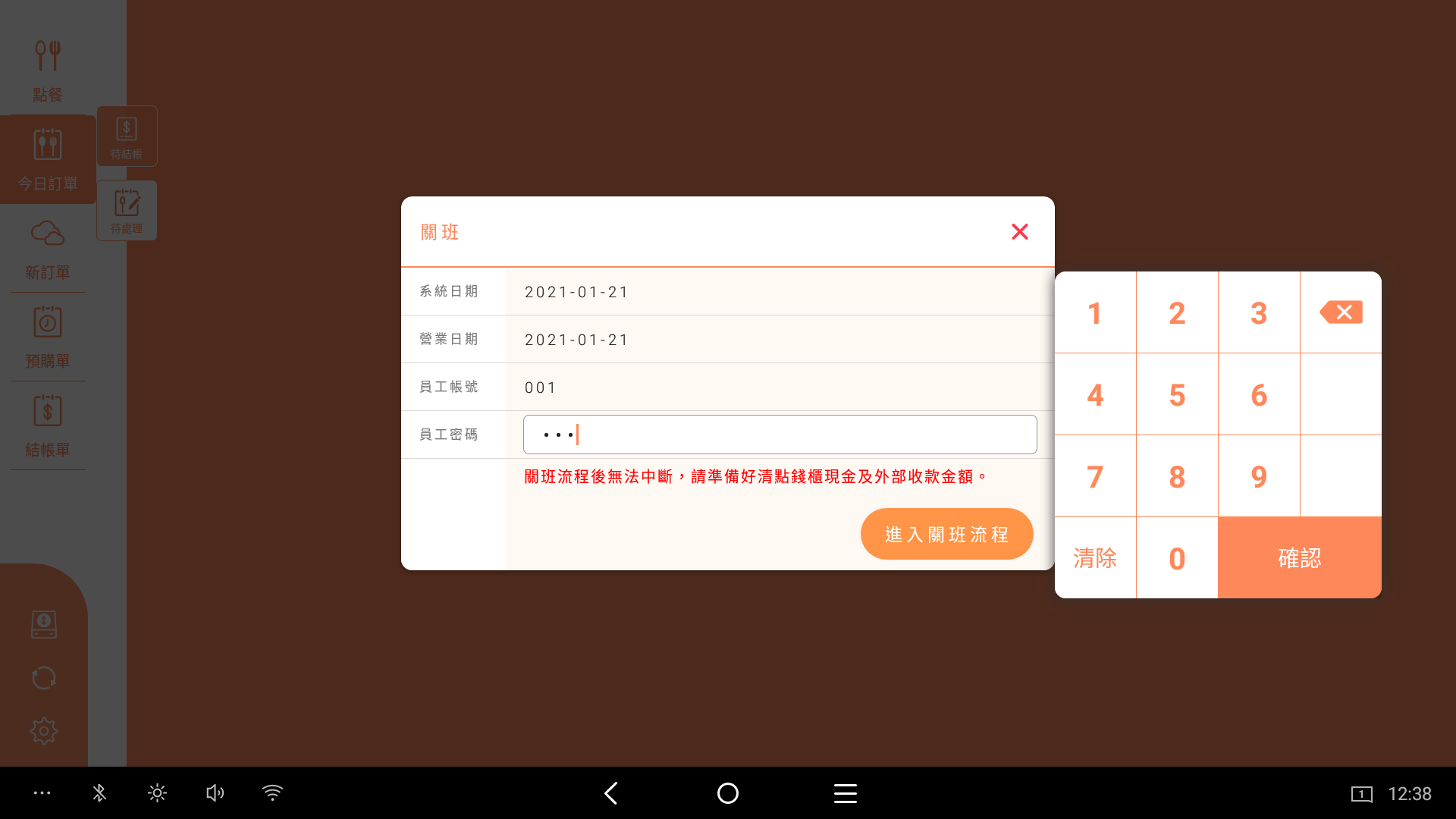 輸入員工的密碼後,就可以點選進入關班流程