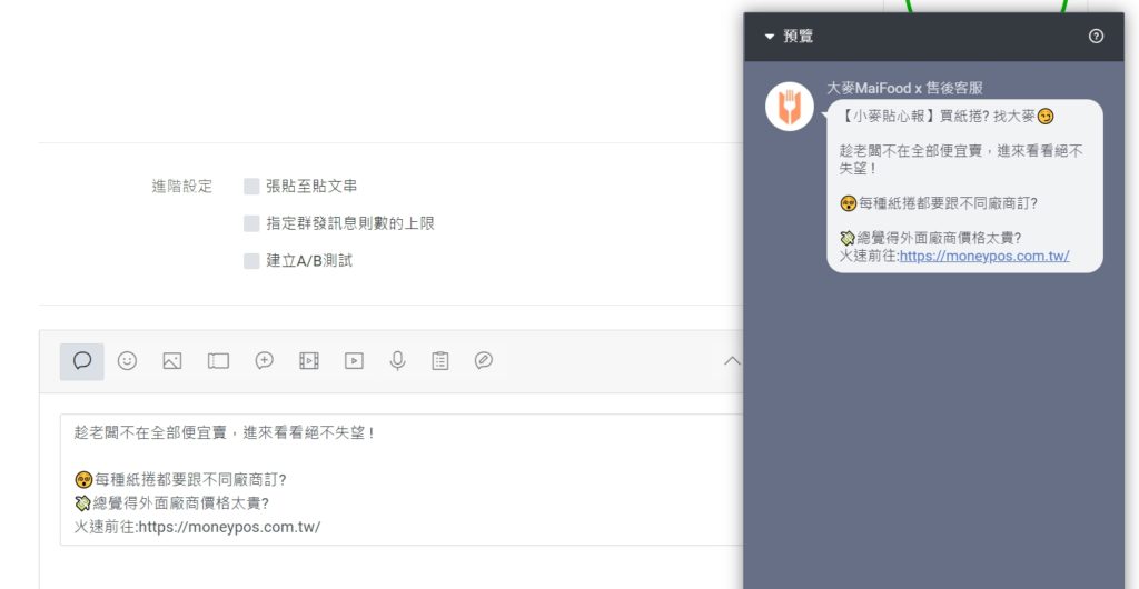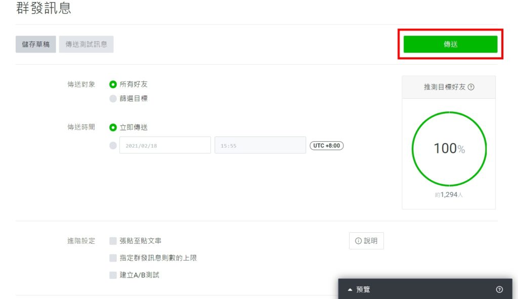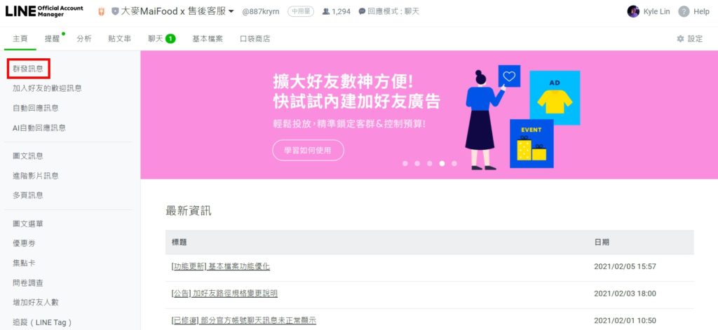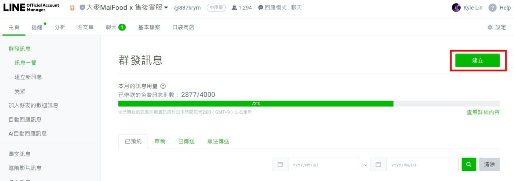 搜尋 搜尋 首頁 » LINE OA » 官方帳號管理 » LINE推播教學 抓緊每位會員!活動資訊送達至每個LINE好友手中零秒差。 1.進入LINEOA網站 https://manager.line.biz/ 2.登入後點選左上方的 群發訊息 3.點選【建立】進入編輯模式※在此頁也可以查詢剩餘發送次數 4.在文字框中撰寫欲發送的文案,並可以透過【預覽】功能檢視發送成品 5.確認好發送對象、時間後點擊右上角的【傳送】按鈕就完成囉 ! ✍🏻找到答案了嗎? Let us know if you liked the post. That’s the only way we can improve. 🙂 🙁 Categories: LINE OA官方帳號管理推播問題Tags: LINE推播群發訊息