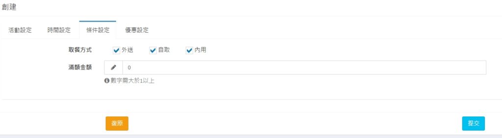 【 店家管理 】/【 行銷活動設定 】/【活動相關】/【結帳優惠活動】/ 【總覽】/【新增】/【1-1 前往設定】