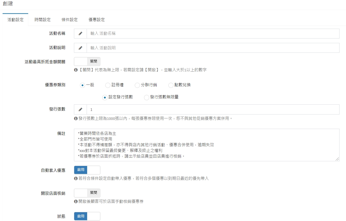 1. 設定優惠券(提供給註冊禮、分群行銷、點數兌換、手動發送優惠券):