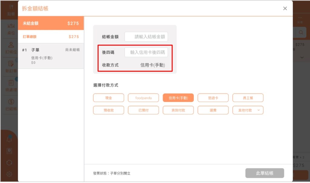 拆單結帳流程中,選擇信用卡(手動),可填寫信用卡後四碼