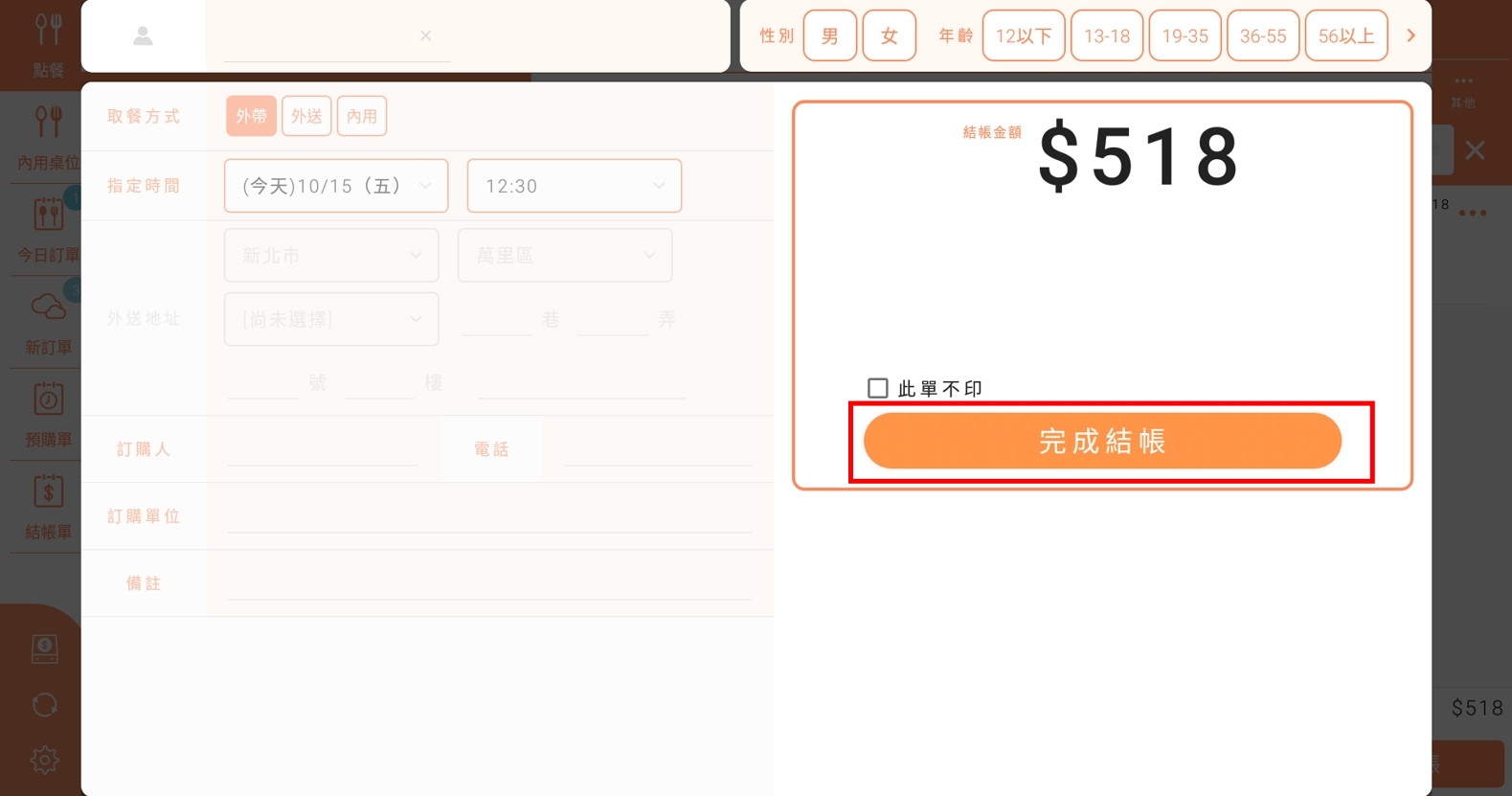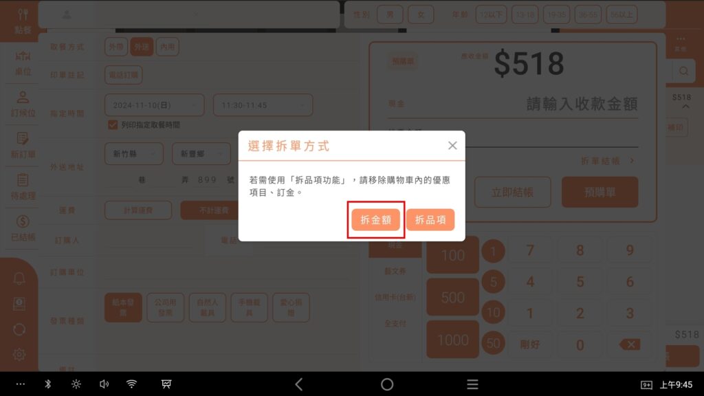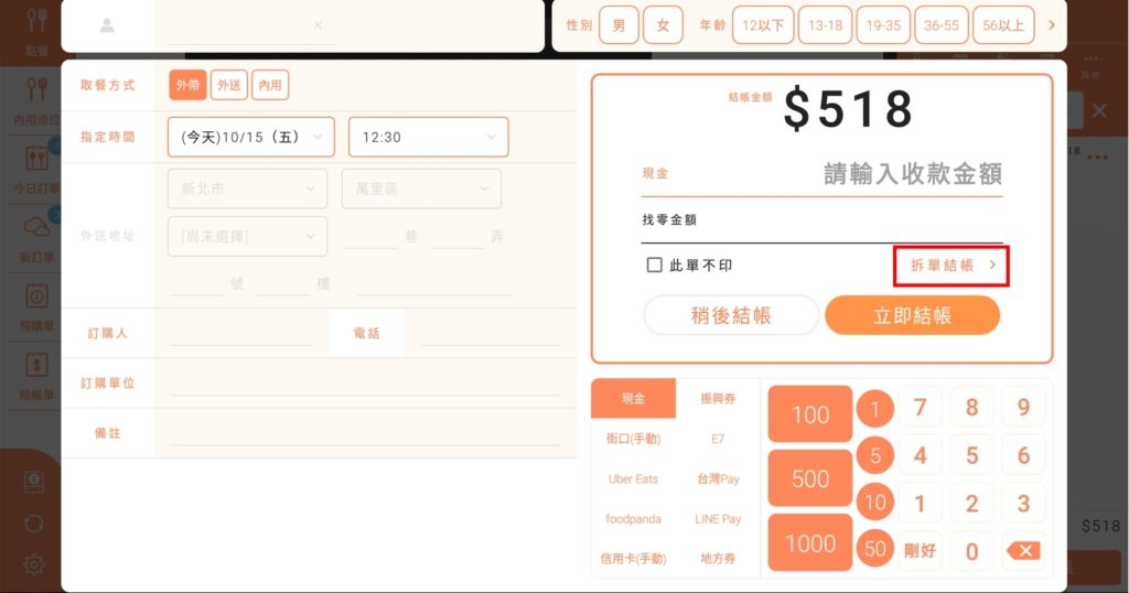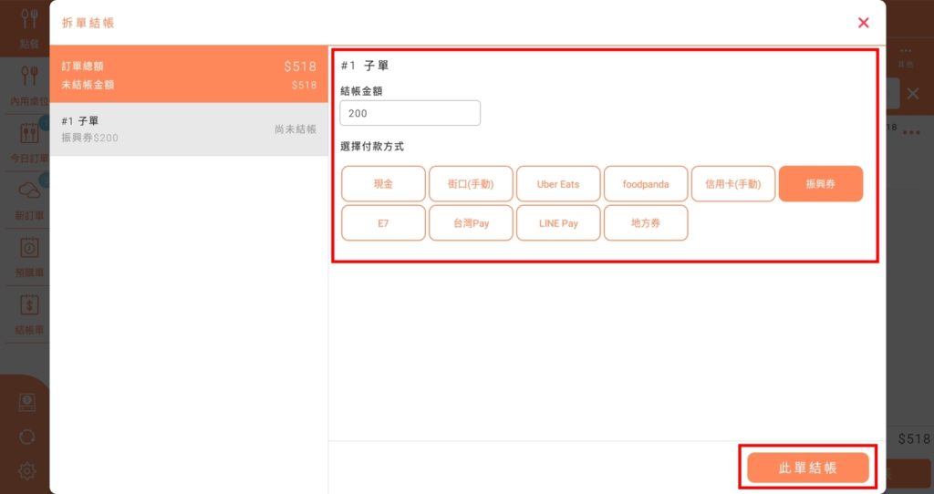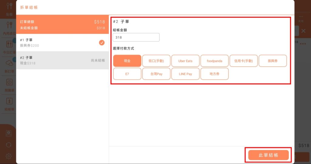 以正常的結帳流程代入適用的優惠後按下結帳後的結帳畫面,按下『 拆單結帳 』