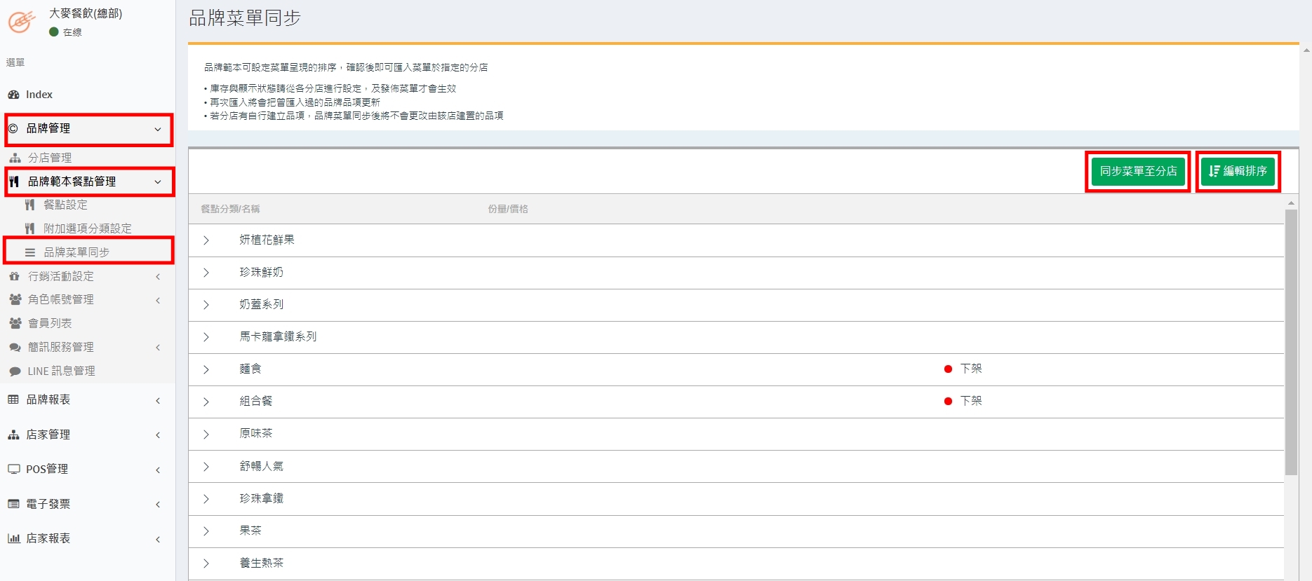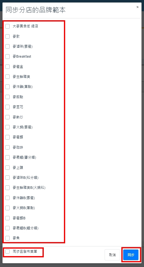 品牌管理 > 品牌範本餐點管理 > 品牌菜單同步 可將設定好的品牌範本菜單同步至指定多個分店點選左上綠色按鈕的編輯排序,可調整匯入品牌菜單的排序偏好,節省一次排序的作業~ 點選左上綠色按鈕的【同步菜單至分店】可顯示目前品牌所屬的所有分店 就可以套入在指定的分店的唷!選定完指定分店後如果需要同步發佈菜單請勾選【 同步且發佈菜單 】最後按下【 同步 】即完成同步作業了唷~****請特別留意****若菜單的筆數較多/或單次選定店家數多,處理時間較長,建議批次進行同步作業唷! ✍🏻找到答案了嗎? Let us know if you liked the post. That’s the only way we can improve. 🙂 🙁 Categories: 後台操作最新資訊線上點餐菜單設定餐點設定Tags: 線上點餐