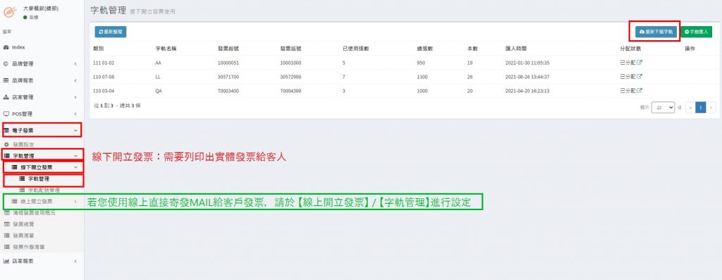此功能是將國稅局有配號的發票號碼都下載到大麥系統,如果此統編還有在其他系統開立發票,有可能會造成發票號碼重複開立。