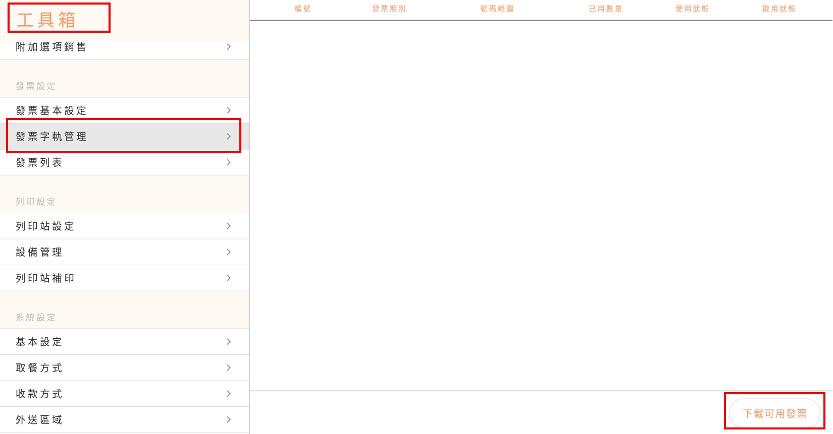 完成上述的步驟後,您可以直接於設備的【工具箱】/【發票字軌管理】/【下載可用發票】