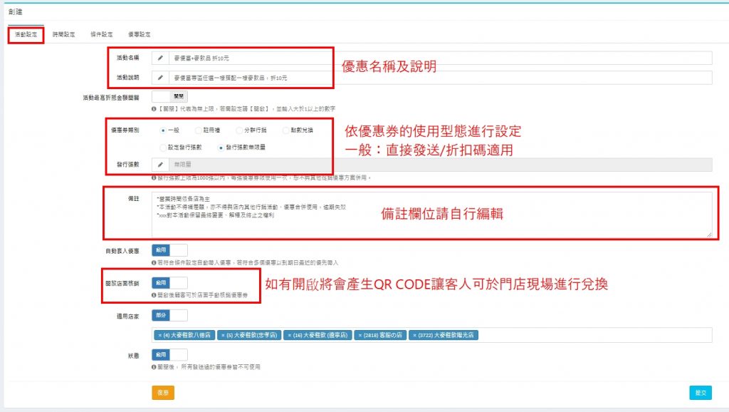 下方以優惠券設定界面提供設定情境: