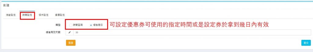 時間設定分頁可設定優惠券到期的時間