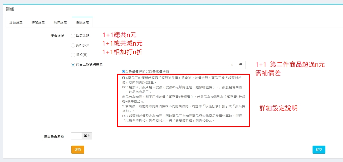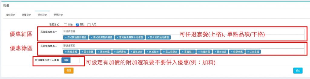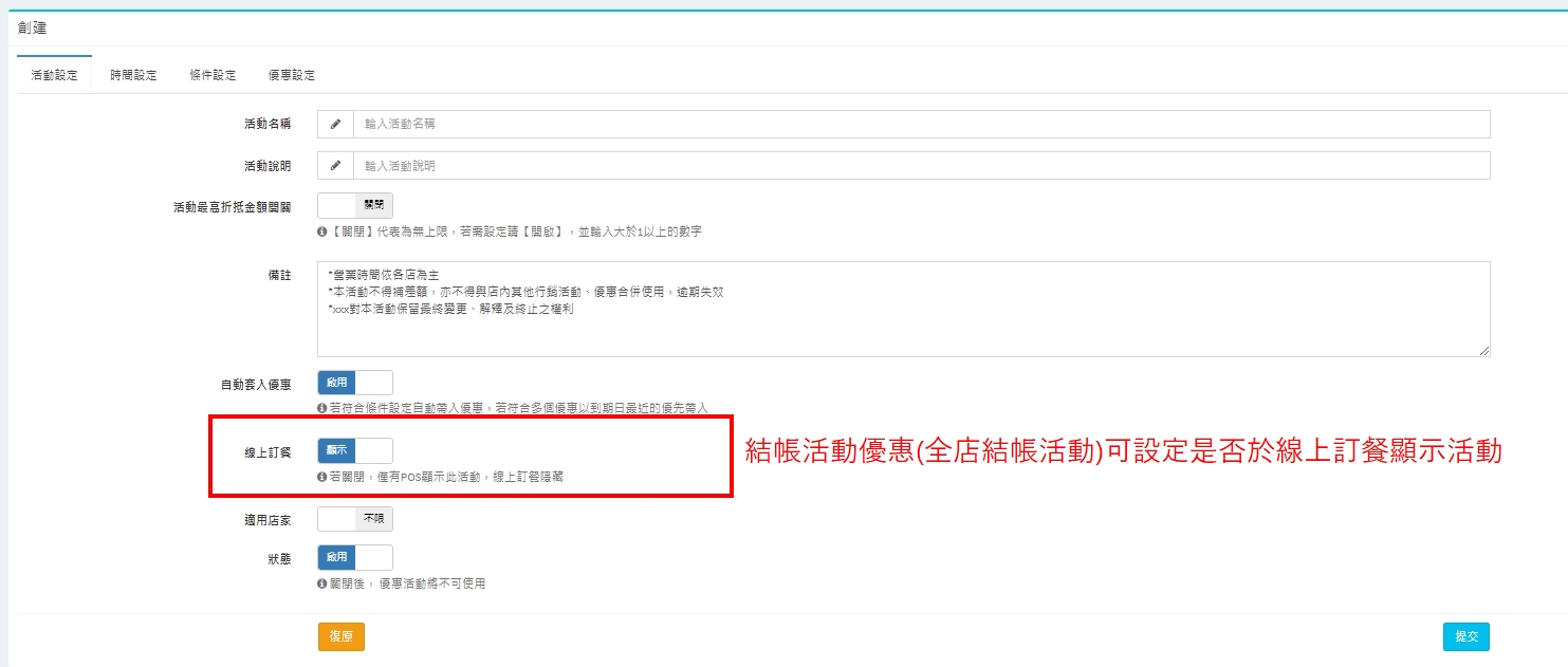 結帳活動優惠的『活動設定頁』設定界面呈現