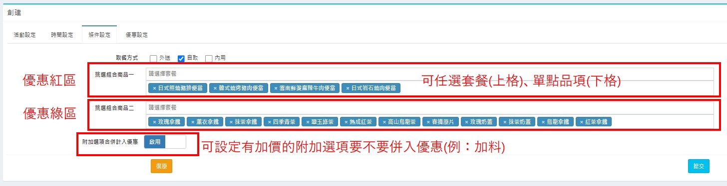 *可選套餐(上格)/單點(下格),如需把附加選項加入優惠計算請開啟下方的開關