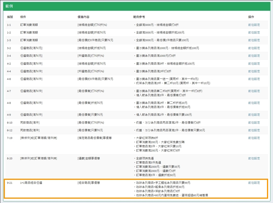 【 店家管理 】/【 行銷活動設定 】/【活動相關】/【結帳優惠活動】/ 【總覽】/【新增】/【9-21 前往設定】