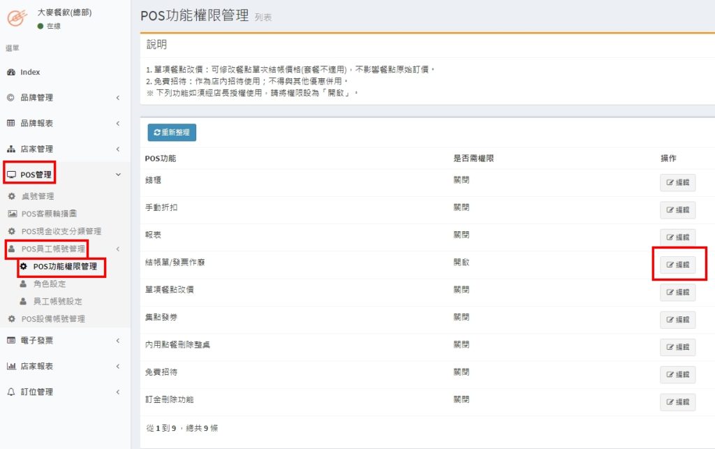 搜尋 搜尋 首頁 » 後台操作 » POS設定 » 員工帳號 » POS接單後作廢權限管理 擔心同仁將已接單的訂單,不小心將訂單退掉嗎?或是擔心不小心誤觸了已結帳的訂單嗎?現在有預防誤觸的功能!!以下讓我們一步一步設定~ 首先我們先登入至後台,【POS管理】/【POS員工帳號管理】/【POS功能權限管理】,將【結帳單/發票作廢】進行編輯,即可開啟權限! 開啟權限後,記得先至【角色設定】確認給同仁的權限是否有包含「POS退單(接單後退單/結帳單作廢)」此權限,請記得要移除,這樣才能發揮作用唷! 讓我們看看POS機上會如何顯示吧! ✍🏻找到答案了嗎? Let us know if you liked the post. That’s the only way we can improve. 🙂 🙁 Categories: POS設定員工帳號後台操作Tags: 作廢待處理訂單接單後權限稍後結帳訂單退單