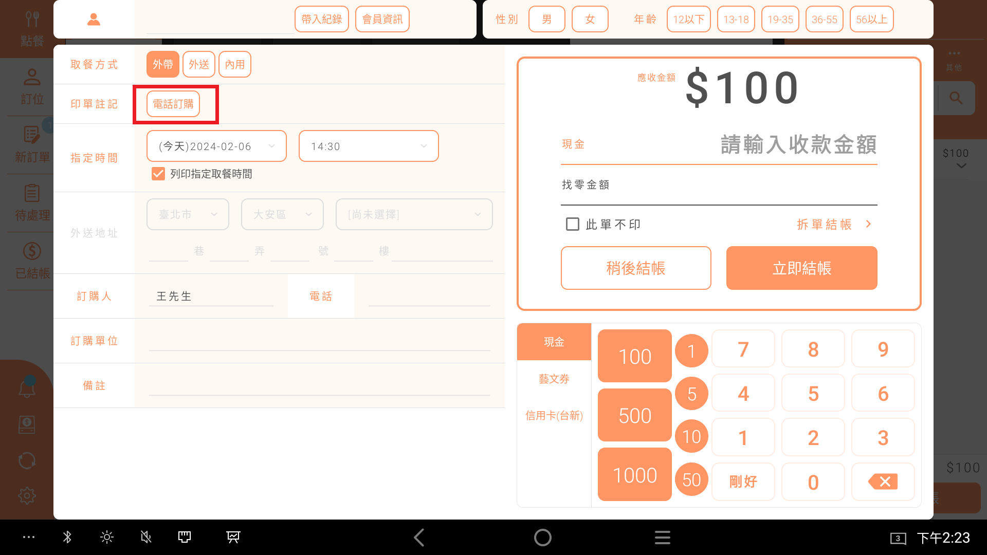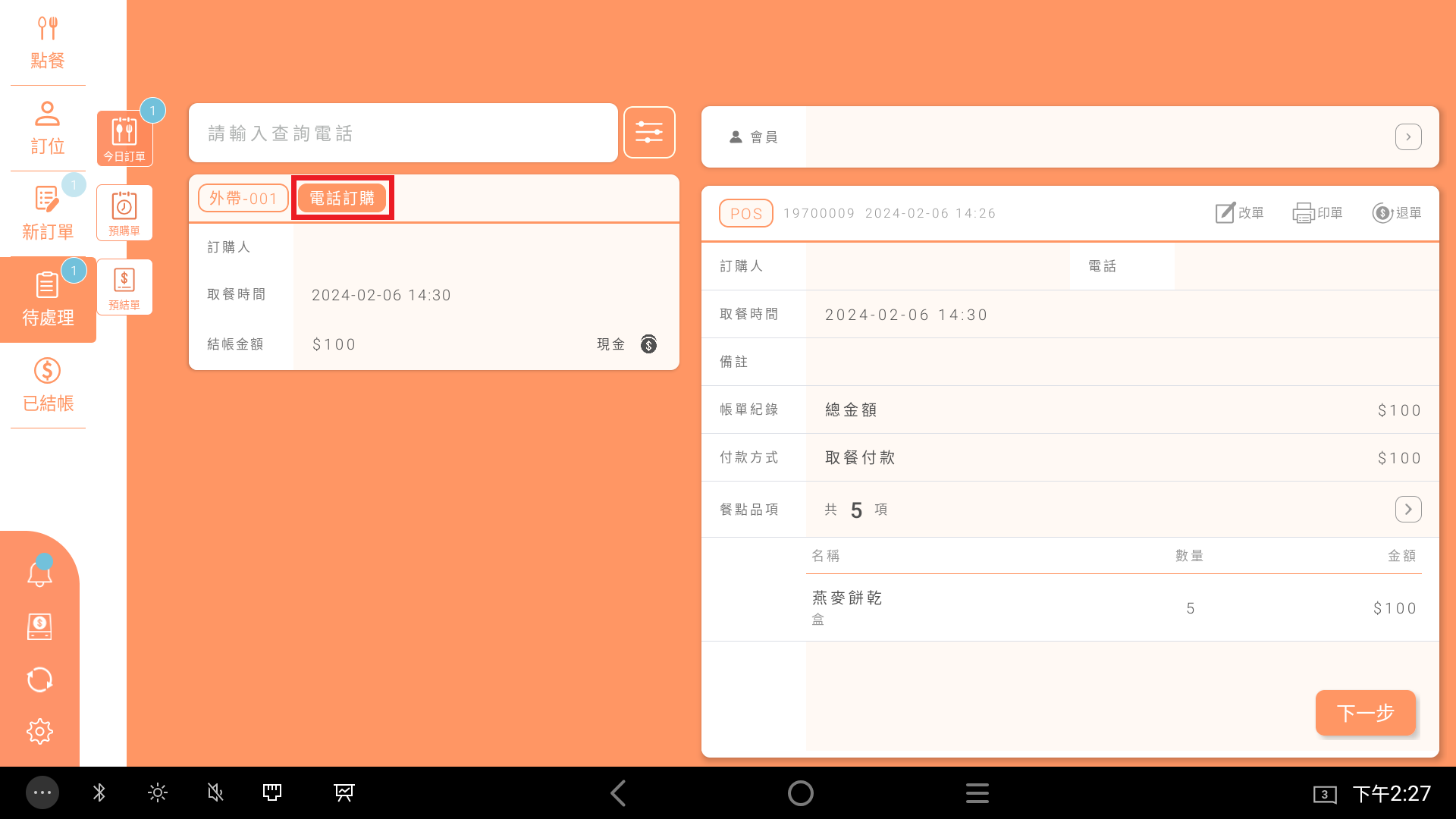 搜尋 搜尋 首頁 » 最新資訊 » POS設備 » POS點餐|電話訂購標籤 您想查詢的是... 接到電話訂購的訂單想要特別進行標註嗎?帶您來看如何操作~ 電話訂購標籤操作 需於結帳頁面操作,在取餐方式下方可選擇印單備註,標註「電話訂購」。 於待處理、結帳單、印製的小白單都可以確認到相關訊息唷! 印出單據呈現 顧客單: 廚房單: 注意事項 標籤貼紙不會印出此註記。 Q&A 1. 在POS點餐時,沒有點選到「電話訂購」怎麼辦?可以補上去嗎?這個狀況會分成兩種:1. 待處理訂單 / 預購單:請在今日訂單中,點擊「改單」,重新結帳時再點選「電話訂購」即可。2. 結帳單:已完成結帳的訂單將無法修改,會需要點擊「作廢」,選擇原因後,再點擊「複製到點餐單」,重新結帳哦! 相關文章 全部 取餐叫號看版 後台 換菜 銷售狀態 取餐叫號看板 | 相關設定 ⭐點餐操作常見問題 POS點餐|備餐完成通知 POS點餐|套餐換菜 POS點餐|新增招待理由欄位 POS點餐|銷售狀態設定 ✍🏻找到答案了嗎? Let us know if you liked the post. That’s the only way we can improve. 🙂 🙁 Categories: MoneyPOS操作POS設備POS點餐最新資訊點餐操作Tags: 電話訂購點餐