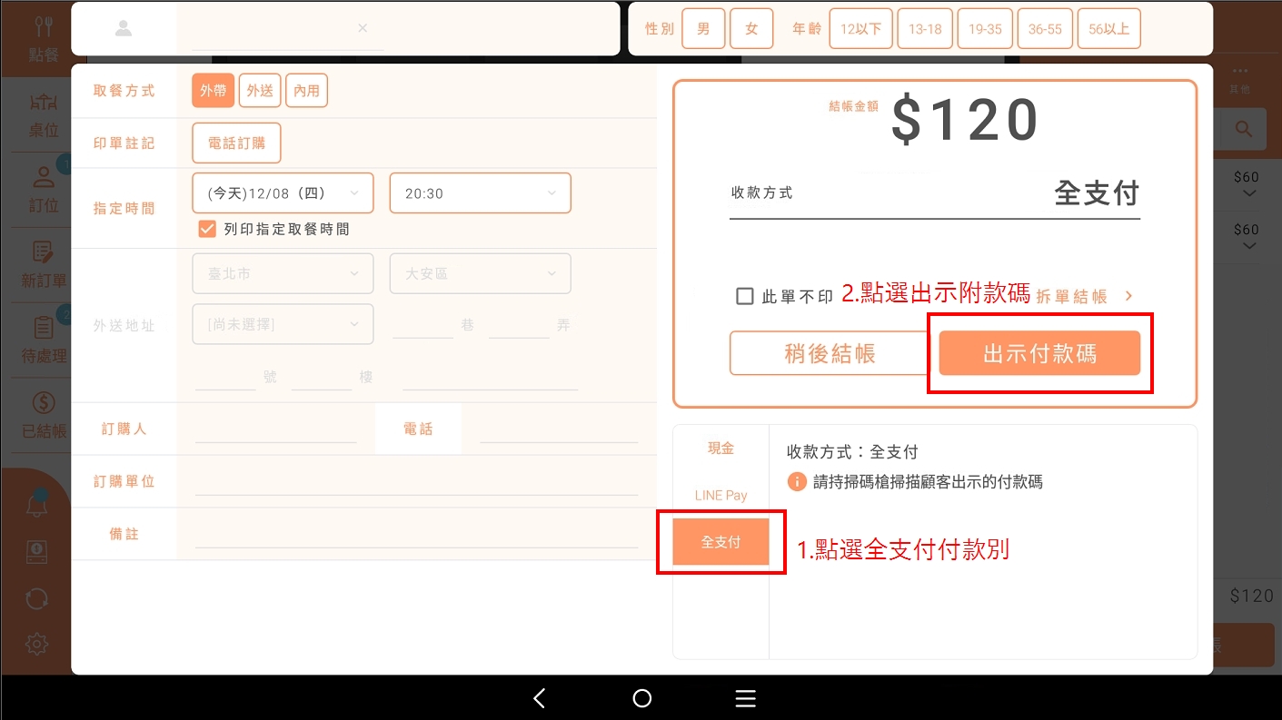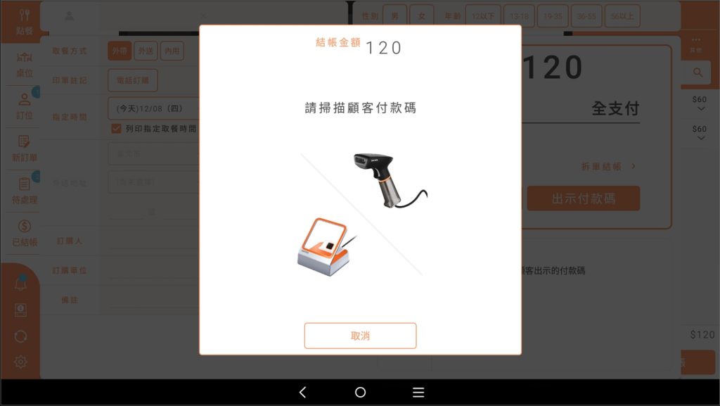 於以下指示畫面時掃描顧客的付款碼(消費者出示手機,店員持掃碼設備進行掃碼)