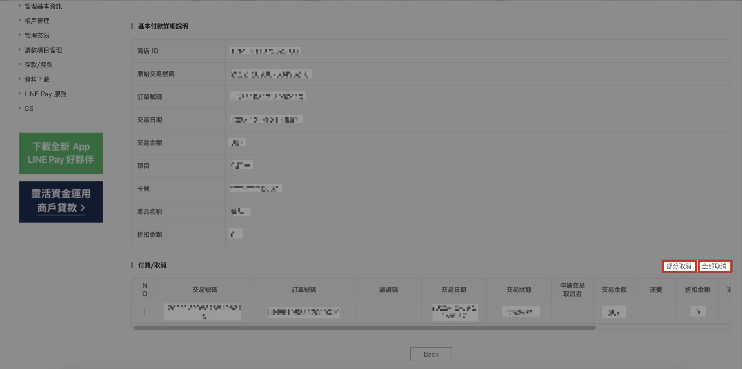 搜尋 搜尋 首頁 » 第三方資訊 » 金流 » LINE Pay » LINEPay| 如何幫客人進行退款/部份退款 串接線上訂餐/POS 如您的模式為串接線上訂餐或是串接POS(使用掃碼槍/小閃)當訂單退單或作廢時,款項系統即會自動刷退 ⚠️注意 目前不支援部分退款,如需退訂特定品項,需作廢/退單,請客人重新下單 使用線下熊大QR code立牌 由於QR模式與系統並無串連,因此作廢/退訂系統仍不會退款需自行進入 LINE Pay後台 或是 透過 LINE Pay 好夥伴APP 進行退款 ➊ 透過 LINE Pay後台 退款 1. 登入LINE Pay後台2. 選擇 左方選單的 管理交易 > 交易紀錄 3. 篩選條件後點選「查詢」 4. 選取需退款的交易號碼 5. 選取部分取消/全部取消,即可完成退款流程 ➋ 透過 LINE Pay 好夥伴APP 退款 1. 請先確認手機有成功下載 LINE Pay 好夥伴APP iOS(iPhone)手機下載連結Android(安卓)手機下載連結 2. 登入 好夥伴APP 3. 查詢交易紀錄 4. 選取需退款的交易 部分取消/全部取消,即可完成退款流程 ✍🏻找到答案了嗎? Let us know if you liked the post. That’s the only way we can improve. 🙂 🙁 Categories: LINE Pay第三方資訊金流Tags: LINEPayLINEPay退款退款部分退款