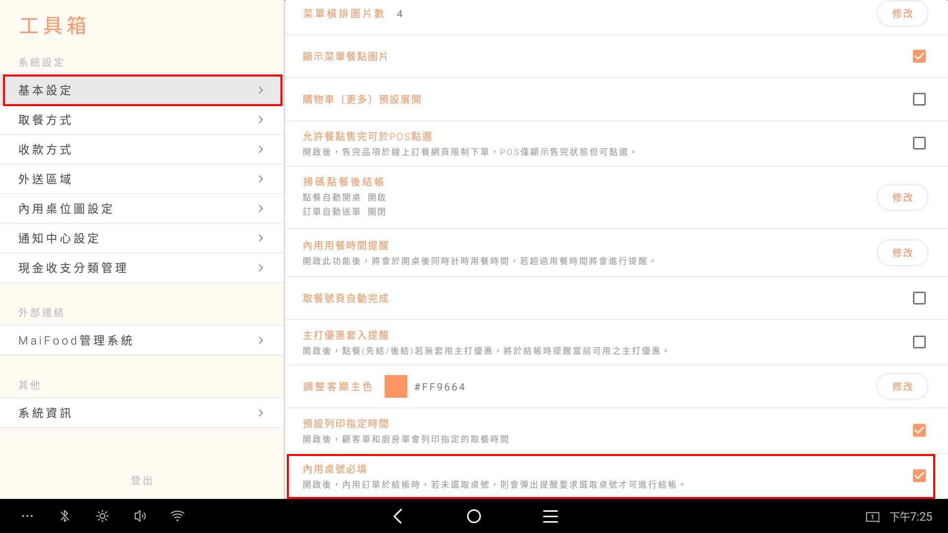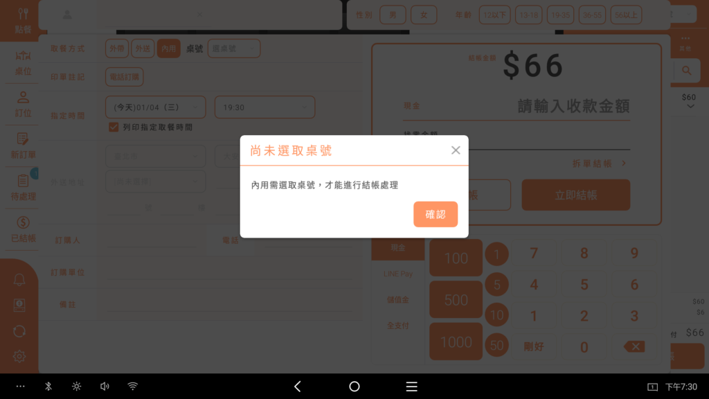 搜尋 搜尋 首頁 » 最新資訊 » POS設定-內用桌號必選設定 內用桌號常常忘記填寫嗎? POS這個檢核設定可以幫助您讓系統提醒您進行設置設定辦法:【 設定 】/【 工具箱 】/【 基本設定 】/【 內用桌號必填 】/【 勾選 】 此項設定出廠時預設不勾選,當勾選後未選擇桌號進行結帳時,會彈出提示示窗,需填寫完畢才能進行結帳。 實際勾選上述設定,點餐時間選擇內用,若未選擇桌號進行結帳 結帳時未填入桌號時彈出的提醒視窗(立即結帳、稍候結帳、存成預購單皆會進行提醒) ✍🏻找到答案了嗎? Let us know if you liked the post. That’s the only way we can improve. 🙂 🙁 Categories: MoneyPOS操作POS設備其他工具箱最新資訊Tags: 必選設定桌號檢核調整顏色