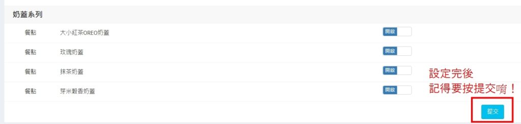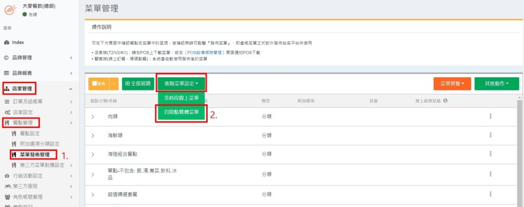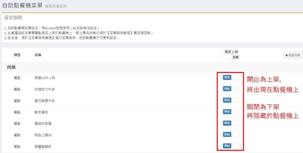 搜尋 搜尋 首頁 » 最新資訊 » 後台菜單編輯| K2 mini 菜單設定 K2 mini自助點餐機想設定特定餐點不顯示嗎?以下引導您進行K2 mini的餐點上下架首先我們會需要到後台【店家管理】/【餐點管理】/【菜單發佈管理】/【進階菜單設定】/【自助點餐機菜單】 接著可以針對餐點進行上下架,設定完畢後請記得要按右下角的提交唷!狀態開啟表示上架,餐點將會顯示在自助點餐機上。狀態關閉表示下架,餐點將會不會顯示在自助點餐機上。 若是要變更餐點的銷售狀態有兩個地方可以調整:1.後台:【店家管理】/【餐點管理】/【菜單發佈管理】調整狀態後需要點選發佈,並同步POS機與K2 mini自助點餐機。2.POS機:【工具箱】/【餐點銷售】調整狀態後,請記得要到K2 mini自助點餐機更新狀態,兩台設備的銷售狀態才會相同唷! ✍🏻找到答案了嗎? Let us know if you liked the post. That’s the only way we can improve. 🙂 🙁 Categories: POS設備後台操作最新資訊菜單設定餐點設定Tags: K2 mini菜單