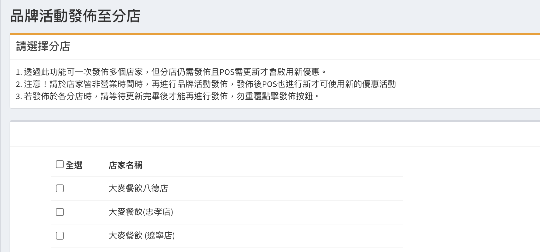 搜尋 搜尋 首頁 » 最新資訊 » 【大麥後台】品牌活動發佈 若連鎖品牌總部新增了行銷活動要如何快速同步更新到各分店呢?=大麥小提醒=此功能設定為『 品牌管理 』限定功能,僅限連鎖總部使用。後台路徑:【品牌管理】/【行銷活動設定】/【活動相關】/【結帳優惠】/【總覽】1. 活動設定完成後,可到【總覽】頁面,點擊頁面右上【活動發佈至各分店】 2. 勾選要發佈的分店小麥小提醒:建議發佈時間為店家非營業時間 3. 確認發佈作業進度點選『更新進度』按鈕可看到目前已更新狀態更新完後請點選『重新整理』更新頁面後,可再次進行多分店發佈 發佈完成後,POS仍須更新同步,才可於POS使用新的品牌活動唷! ✍🏻找到答案了嗎? Let us know if you liked the post. That’s the only way we can improve. 🙂 🙁 Categories: 後台操作最新資訊結帳優惠活動行銷活動設定