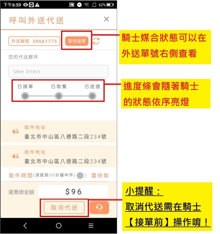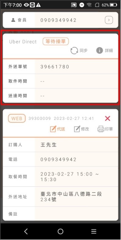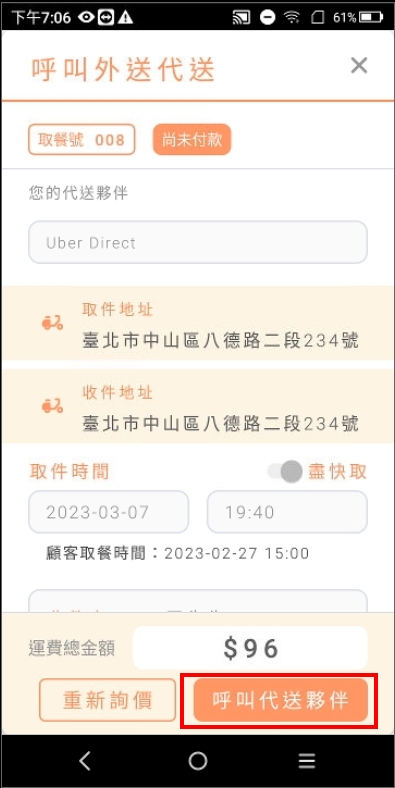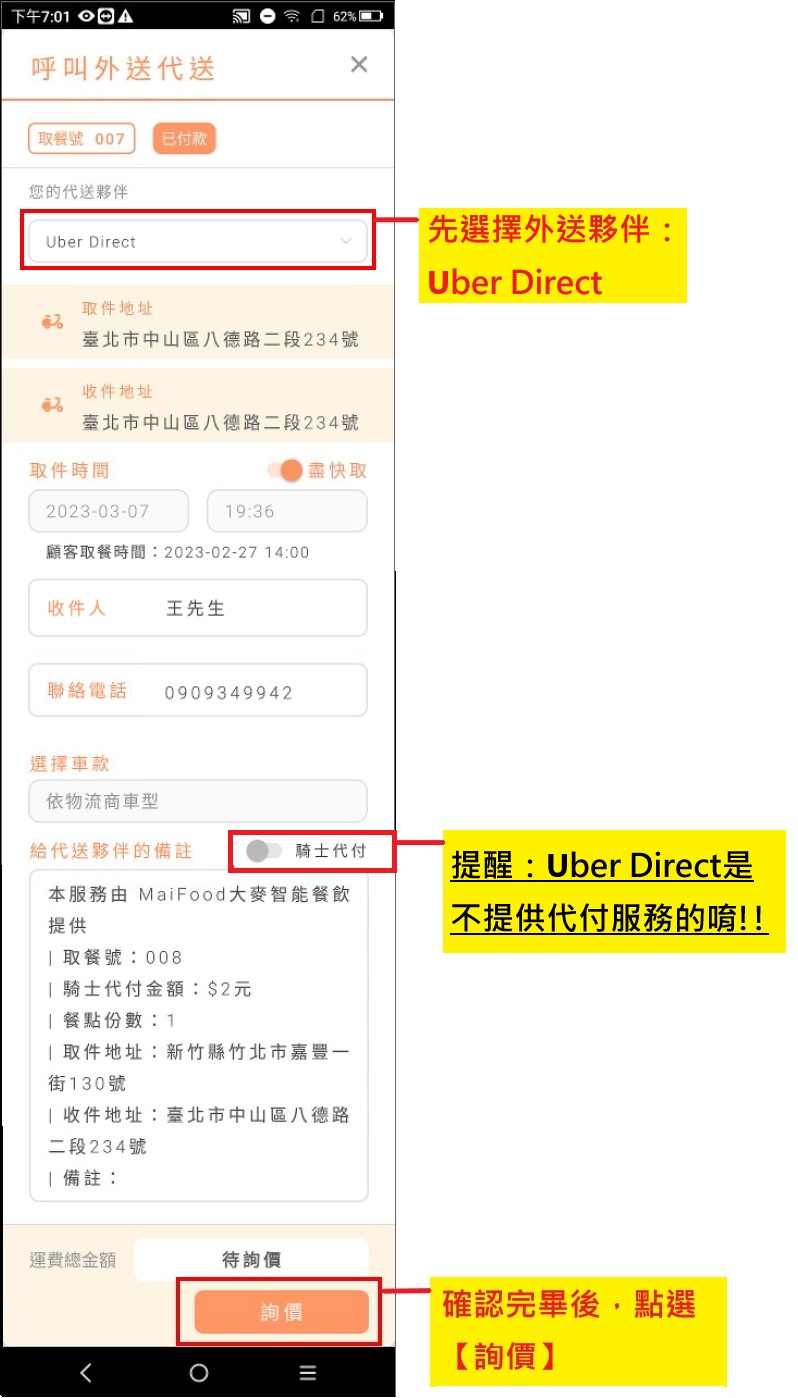 搜尋 搜尋 首頁 » 第三方資訊 » Uber Direct|V2呼叫Uber Direct 在接單機要怎麼進行代送服務呢?以下一一引導您進行操作!在V2接單上呼叫外送夥伴,可以在操作前,先設定呼叫視窗是否要自動於結帳後跳出唷! 呼叫前,訂單需先「完成結帳」,變成結帳單後,右上角才會出現代送按鈕,讓我們點選「代送」按鈕一下! 點選代送後,請依序設定1.選擇外送夥伴2.進行詢價小提醒:Uber Direct是不提供騎士代付功能的唷! 進行詢價後,會顯示運費總金額,此金額將從「大麥點」進行扣款。沒問題後再點選「呼叫代送夥伴」進行騎士的媒合。點我登入查詢大麥點餘額 呼叫代送後,可以確認騎士的接單狀態如需取消代送,需於騎士接單前操作唷! 關閉呼叫外送代送視窗後,可以於訂單詳細資訊上方點選『同步』後查看最新外送進度。 ✍🏻找到答案了嗎? Let us know if you liked the post. That’s the only way we can improve. 🙂 🙁 Categories: Uber Direct物流第三方資訊