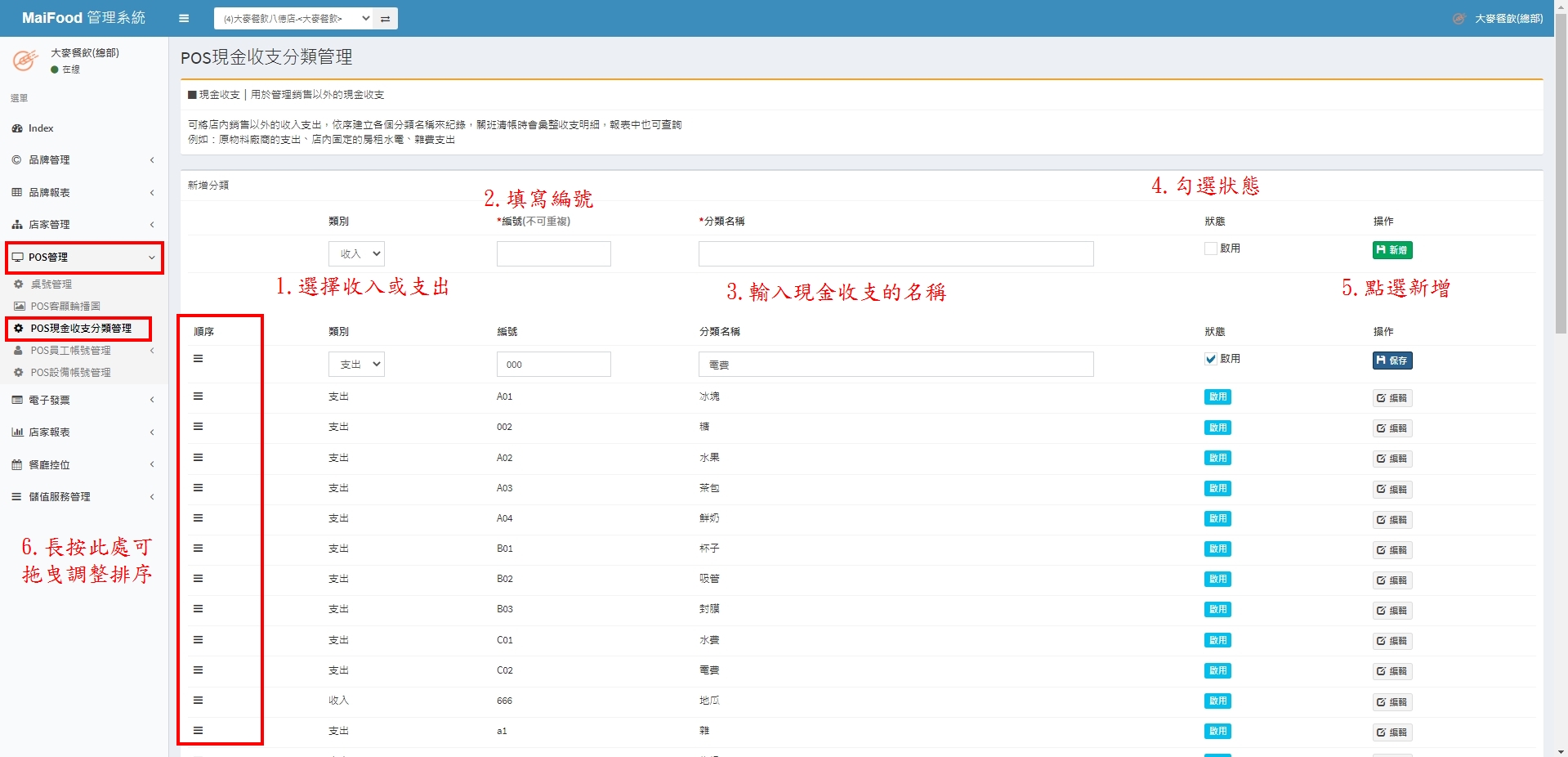登入後台>>POS管理>>POS現金收支分類管理 >>新增>>保存,讓你輕鬆管理店內銷售外的現金收支