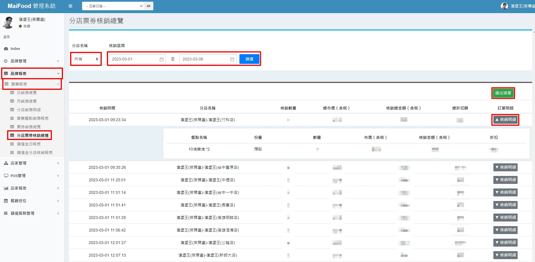 分店票券核銷總覽可選擇旗下分店及核銷日期區間,篩選出各分店的報表明細,點選訂單明細的【核銷明細】,可查看分店的票券明細,也可點選【匯出清單】匯出報表明細檔案