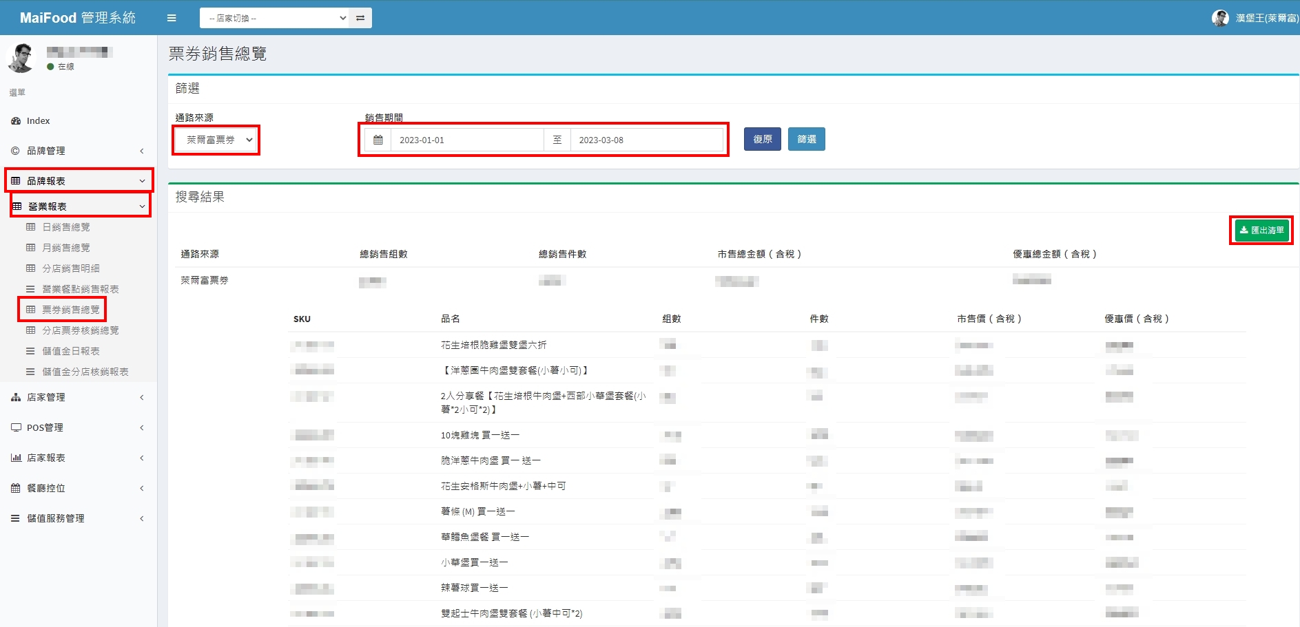 票券銷售總覽可選擇通路來源及銷售期間,來篩選出欲觀看的銷售報表